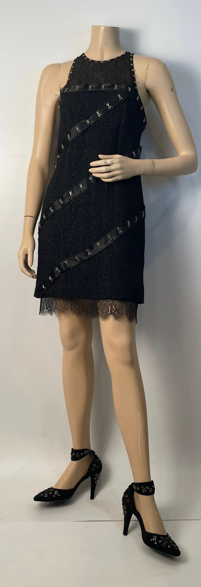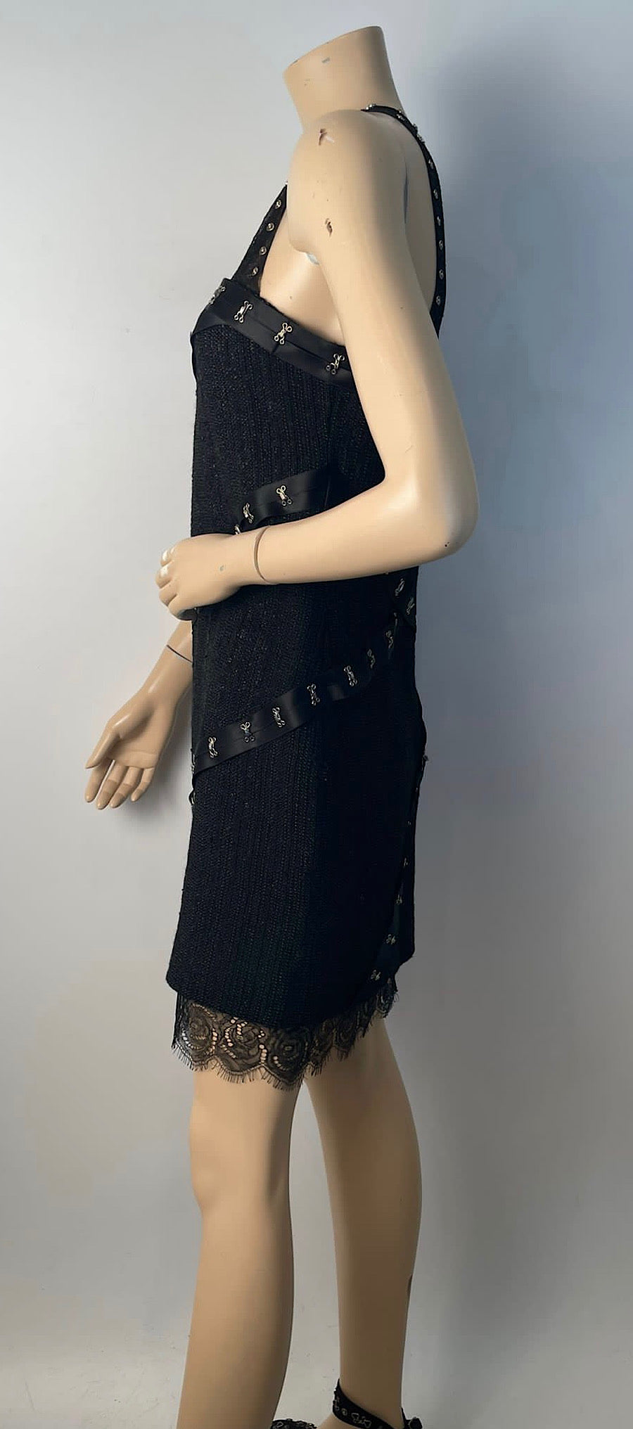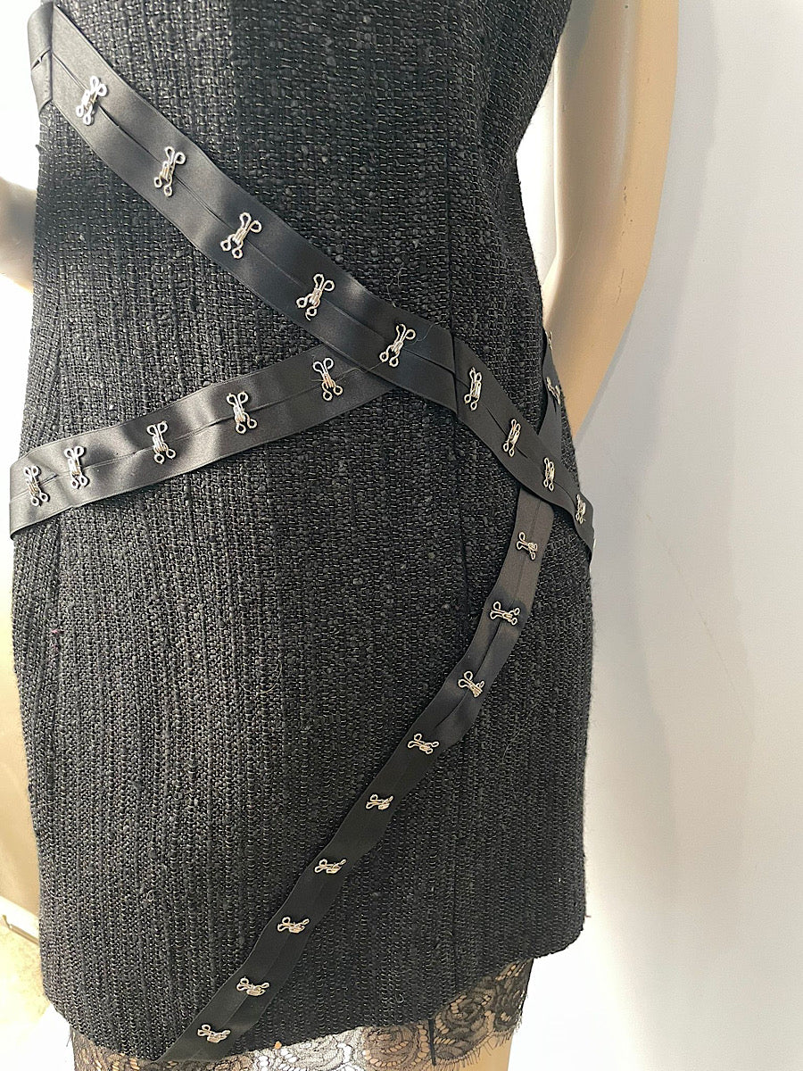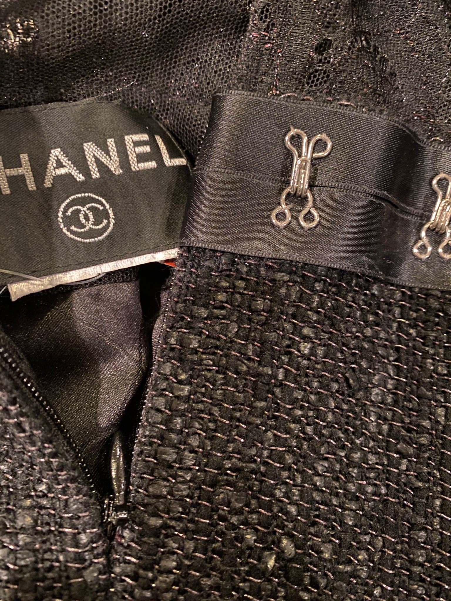 Chanel 03A Snap Collection Black Tweed Boucle Satin with Camellia lace dress US 4