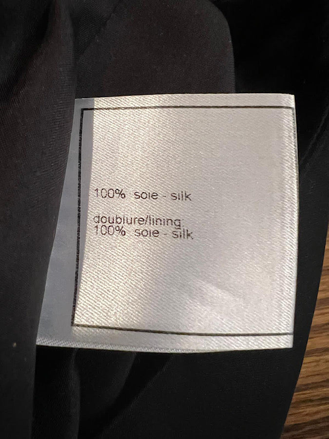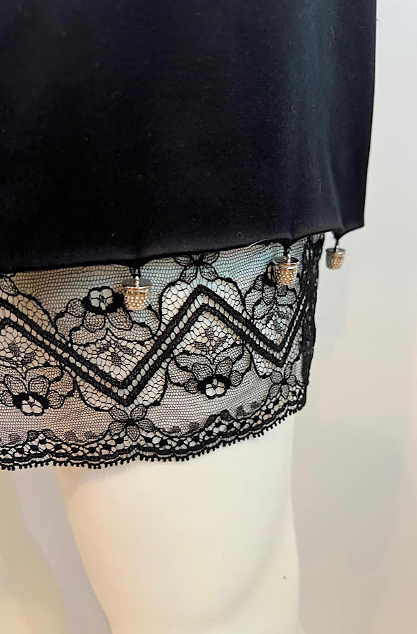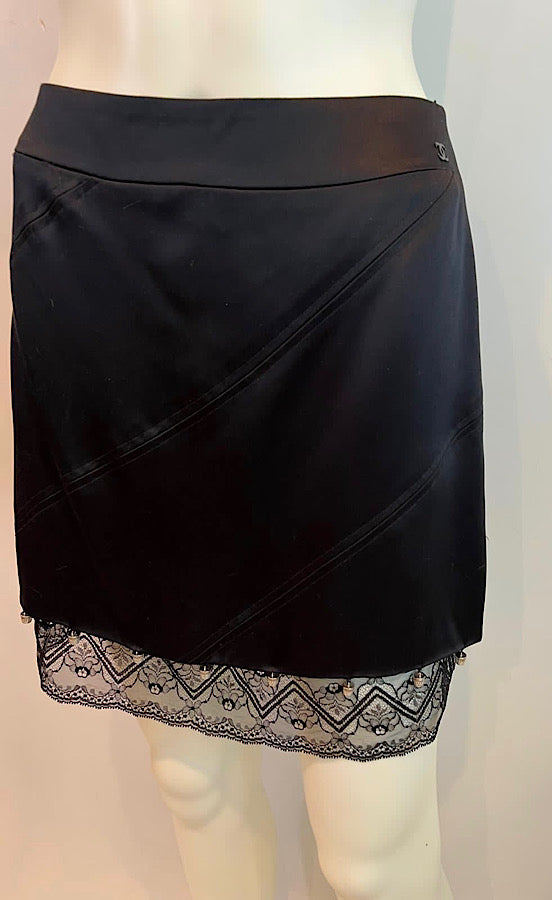 Short and Sassy Chanel 03A 2003 Fall Snaps Collection Black Satin Mini Skirt. This skirt features a 3" lace hem with silver embellishments. It has no waistband, 2 flattering angled seams across the front, and a hidden zipper in the back. Fully lined, and has a metal CC logo at the waistline.