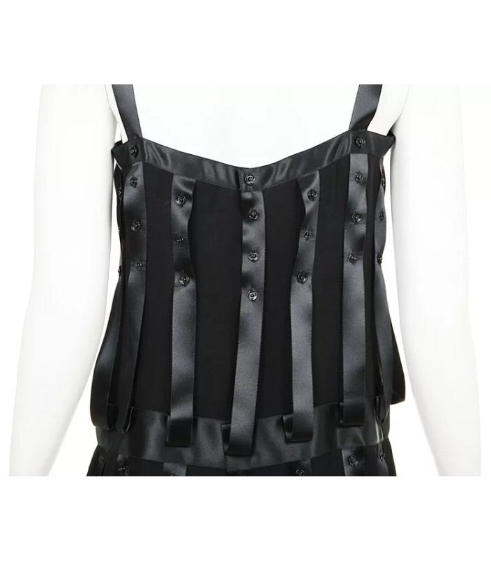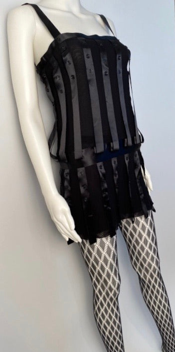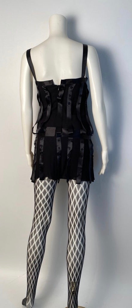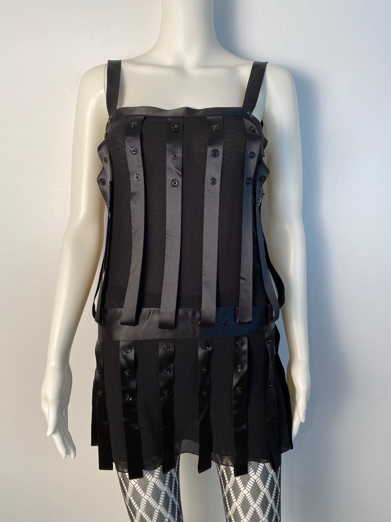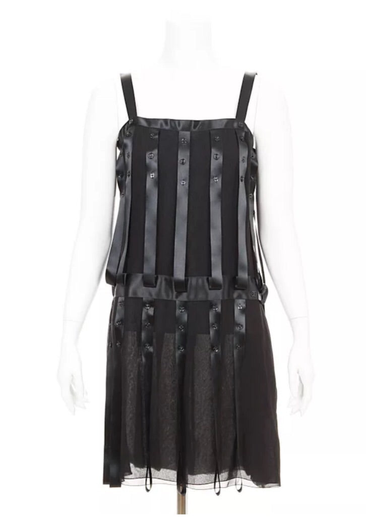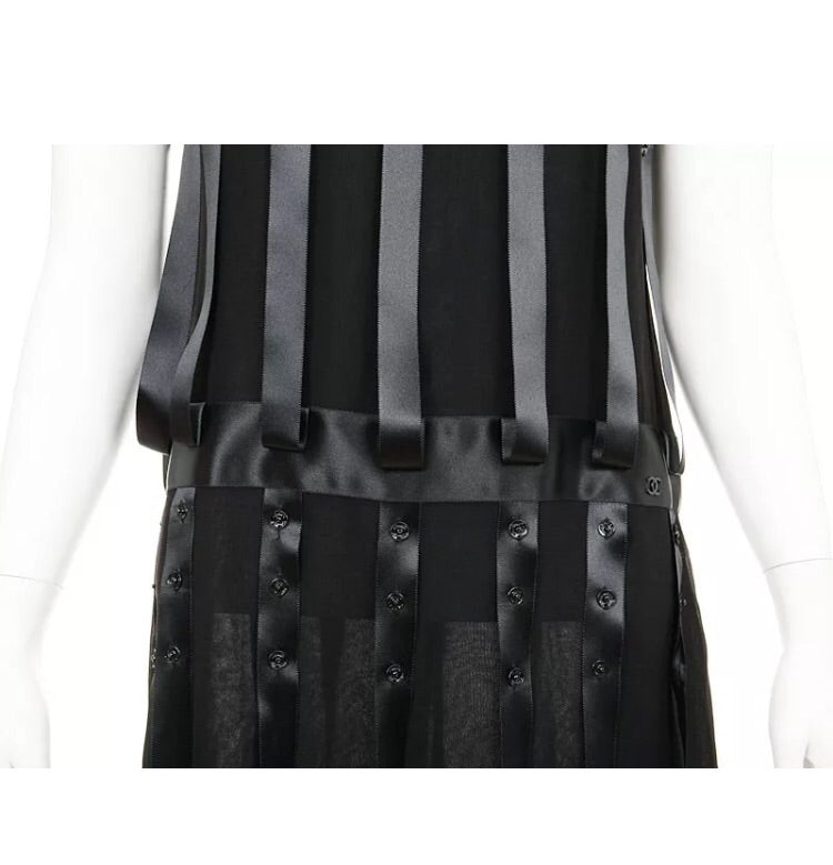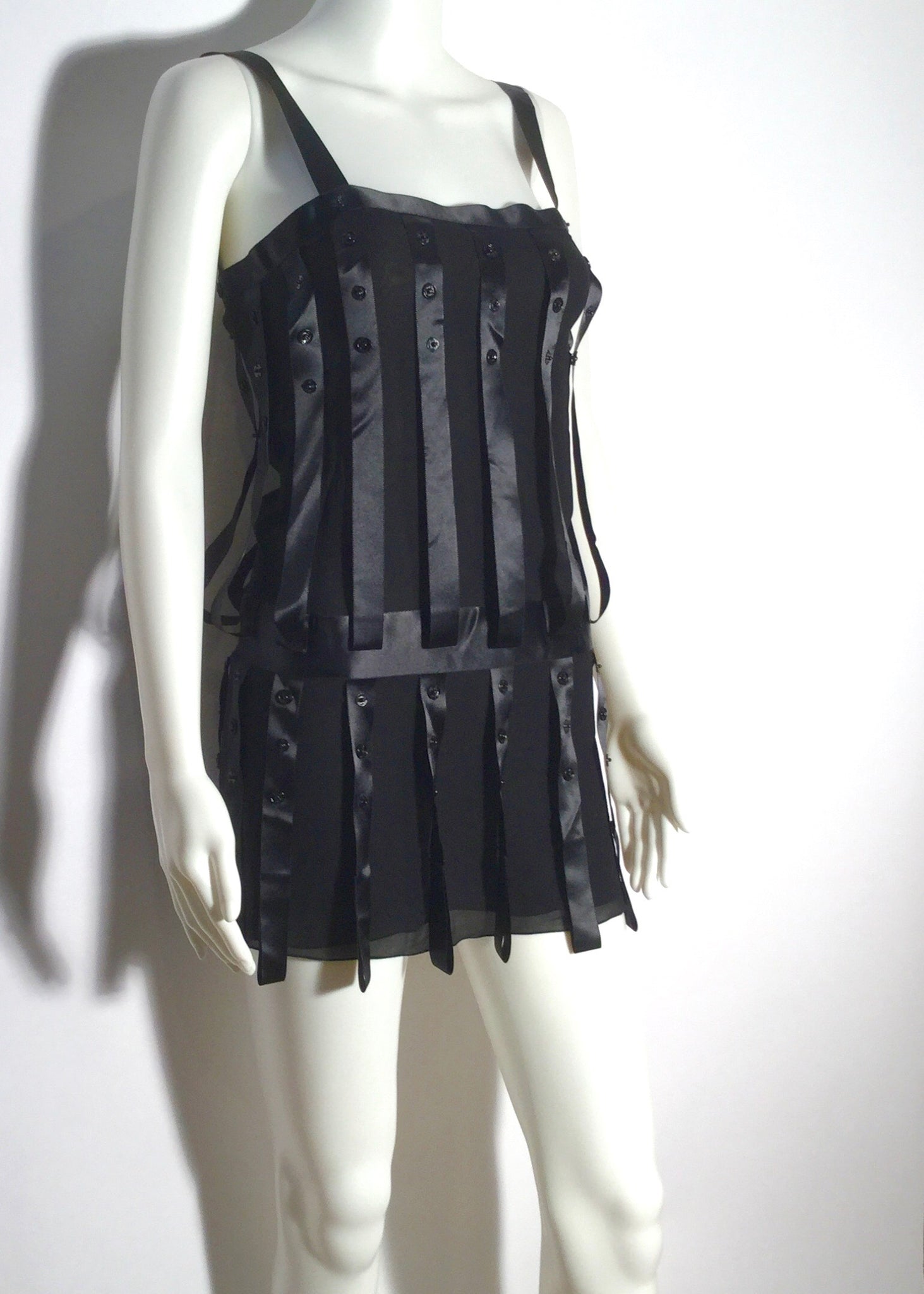 Beautiful Chanel mini tunic dress. It is from Chanel's famous "Snap Collection" 03A, 2003 Fall Runway. It is black with alternating strips of silk, embellished with metal snaps. Zips up the back. Metal "CC" logo.