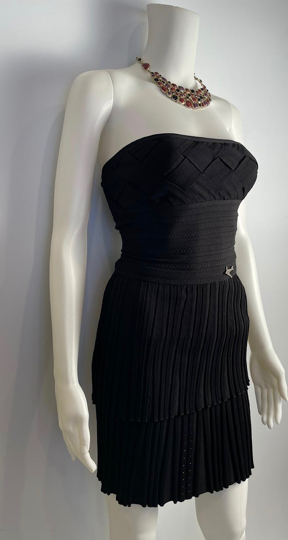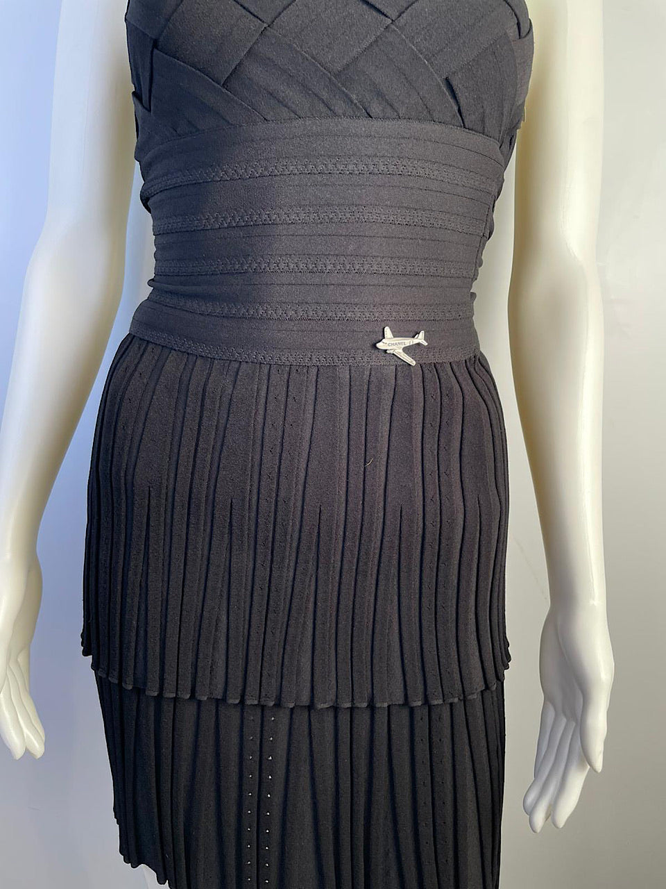 Chanel black stretchy 2 piece dress. It has a strapless basket weave top with a bottm half of tiny pleats. The skirt has an elastic waist hidden under the top overhang, and overlapping sections of tiny pleats. The top 6" of the skirt is smooth. The top section is a beautifully done basketweave with 1 3/4" wide strips of fabric, the next 5" has horizontal fabric then you have the 10" of small pleats.