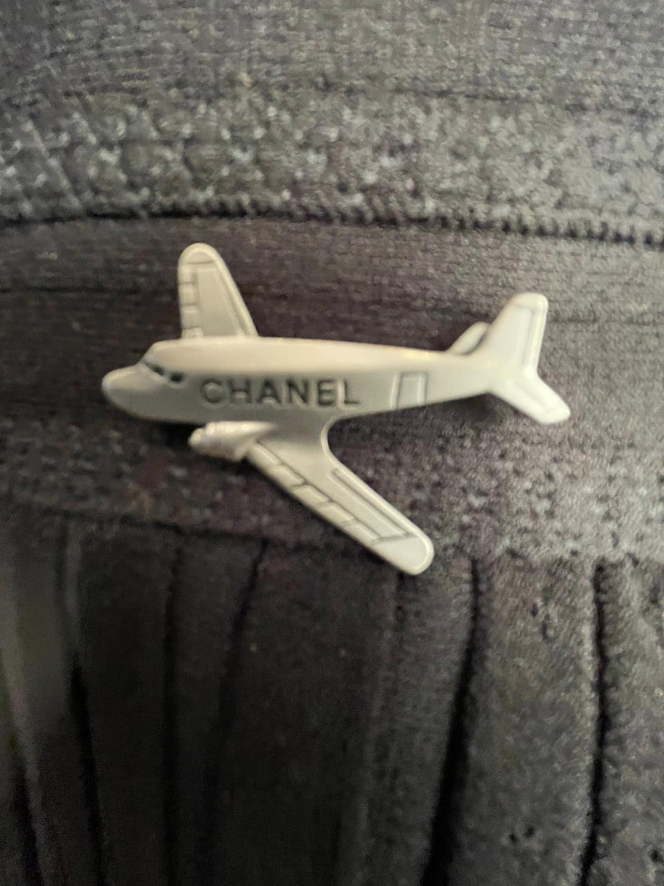 There is a an enamel over metal airplane on each piece which is 1.5” long and 1 1/4" wing to wing with the word "Chanel" on each one. This set looks like 1 piece when you wear it, or can be worn separately for different looks.