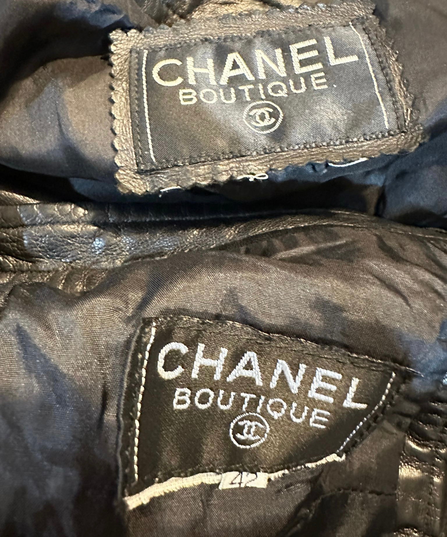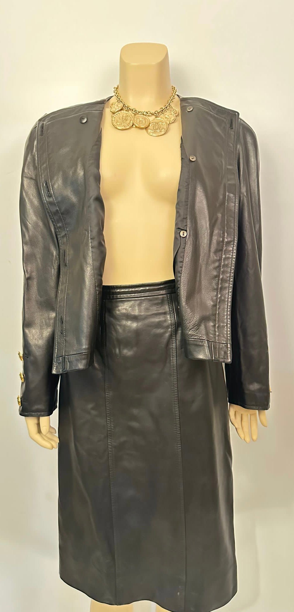 Vintage Chanel 1980's/early 1990’s black leather suit. Skirt and versatile jacket with a total of 13 large gold logo buttons. There are 3 on each sleeve, 1 on each of the 2 flap pockets, and one on the skirt at the waist. The leather looks very good-no tears, stains, pulls, bare spots, fading, or cracks-it is very soft and pliable.