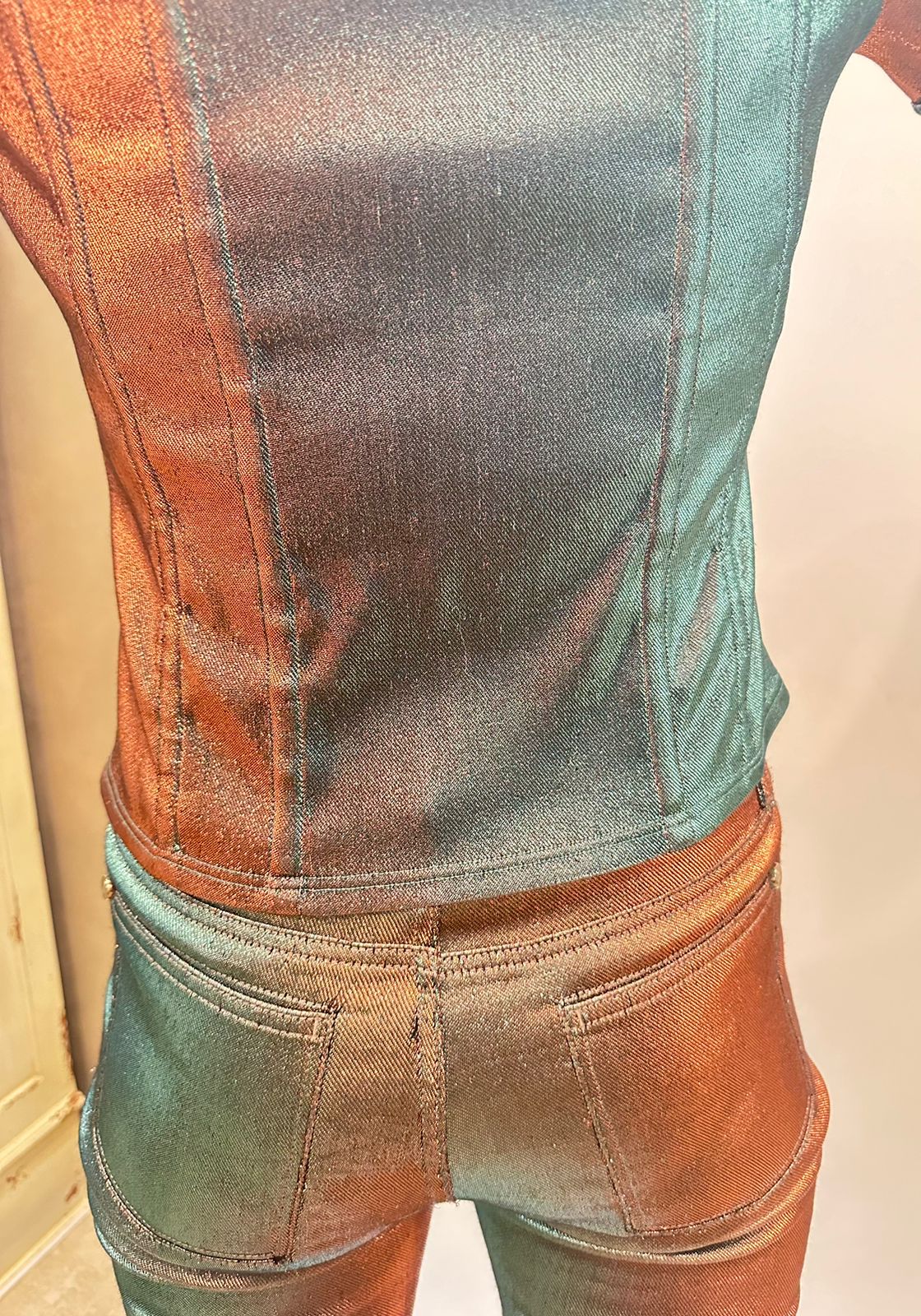 | Pants FR 38 | Pants have fly front, low waist, 2 back pockets and 2 curved hip pockets. Button at the waist with CC logo, matching the smaller version which has a stud at the corner of the 4 pockets. Waist 31.5” (sits low) Hips 35”-38” fabric is stretchy Inseam 32” Rise in front 9” Rise in back 14” The legs are tapered and measure 10" around the bottom of the leg at the hem. |