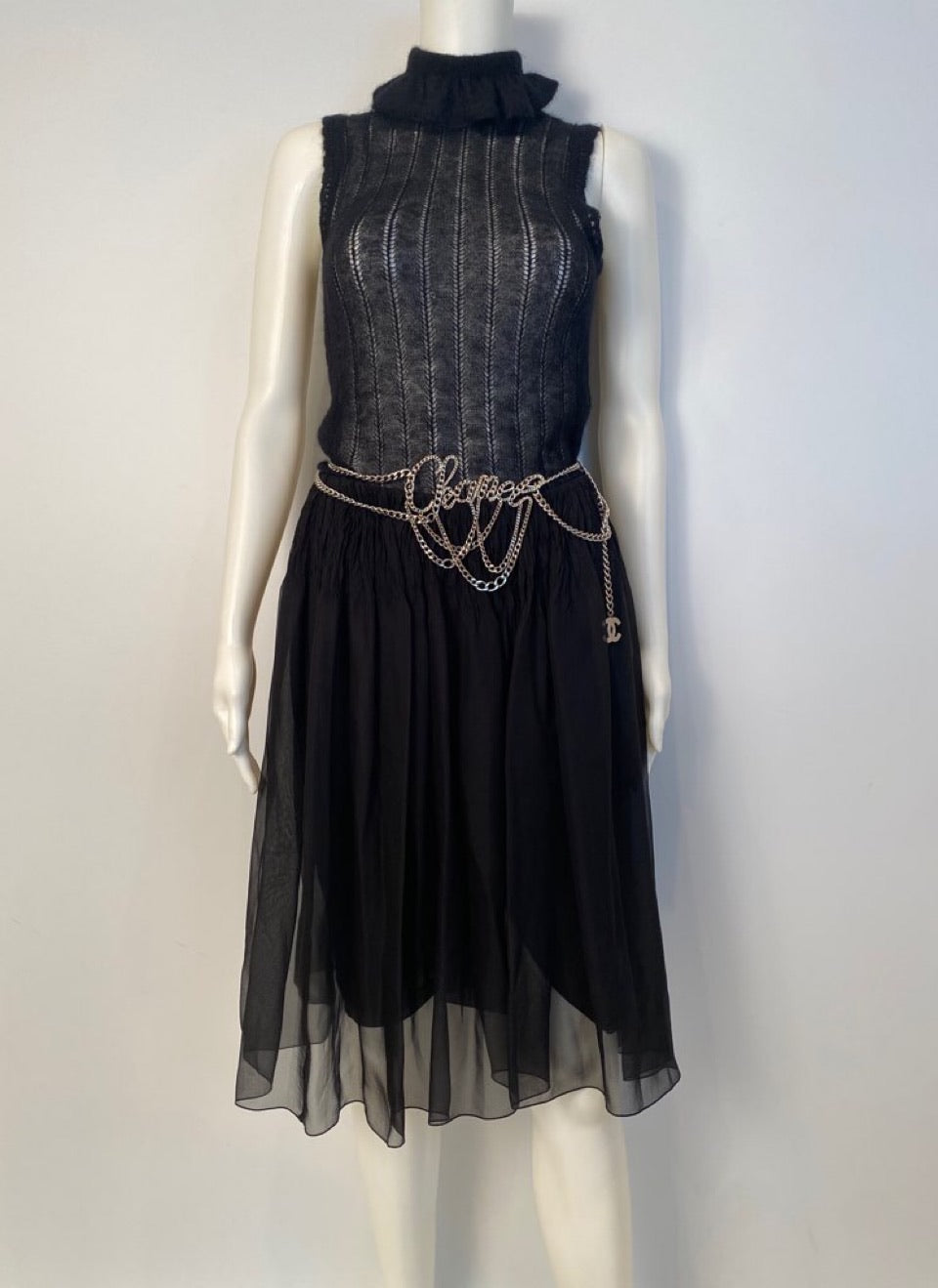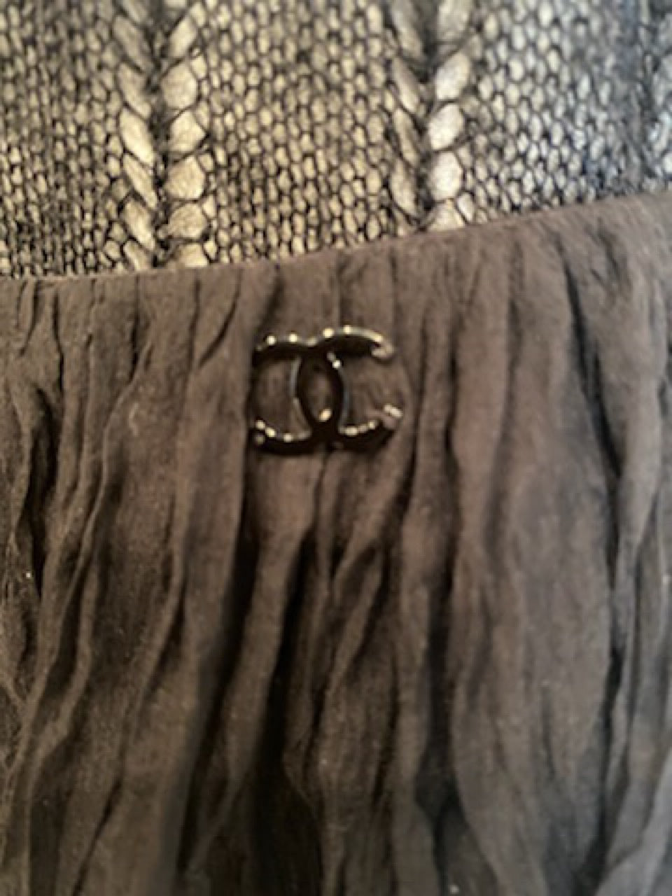 Chanel versatile black chiffon skirt that goes with everything! From the Chanel 06A, 2006 Fall Collection. Black silk lining, back zipper, no waistband. The Top 4" are lightly gathered, with a metal "CC" logo at the waist.
