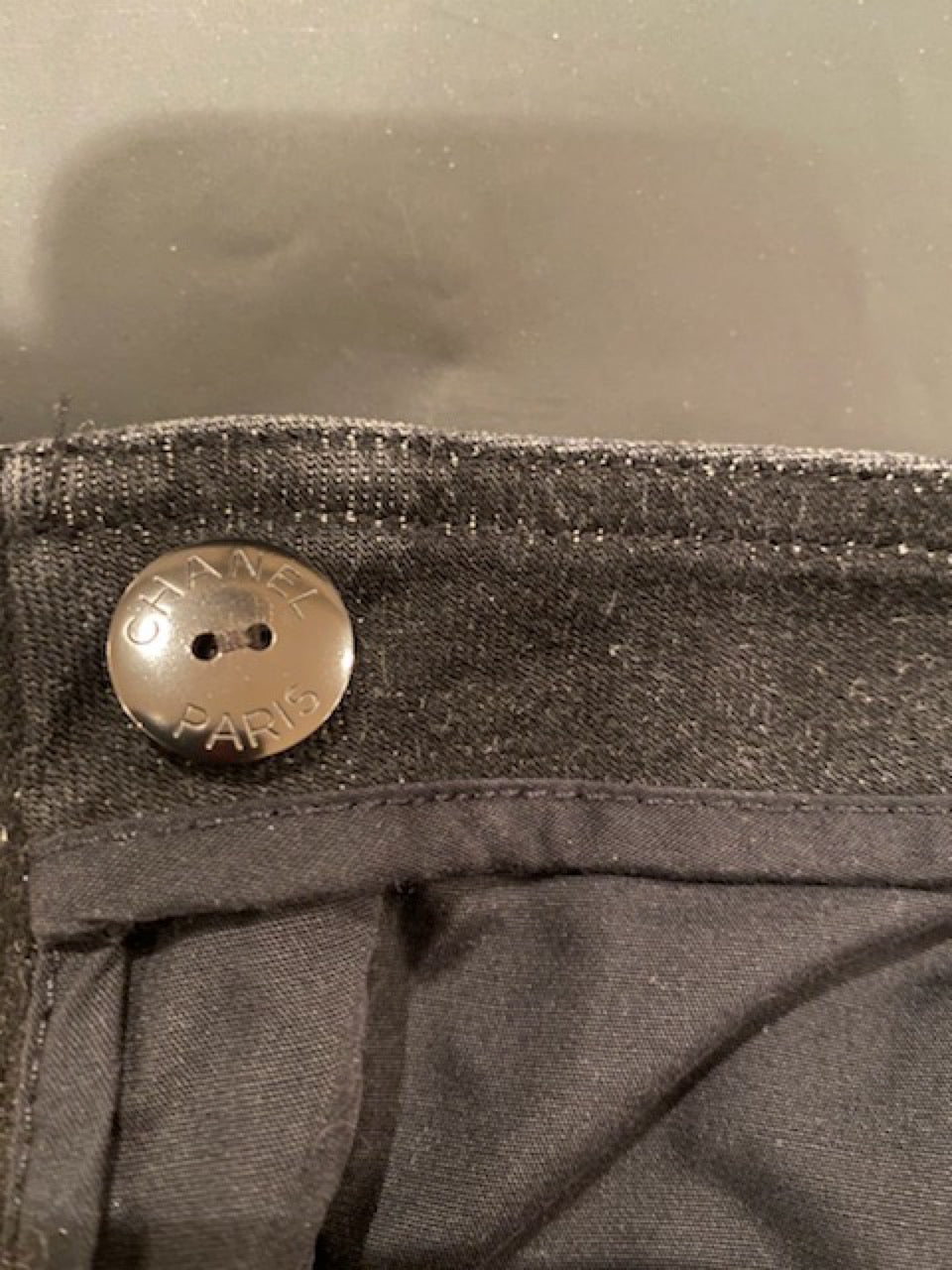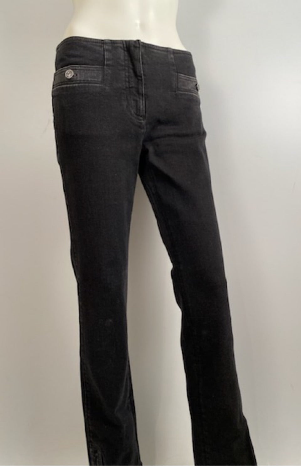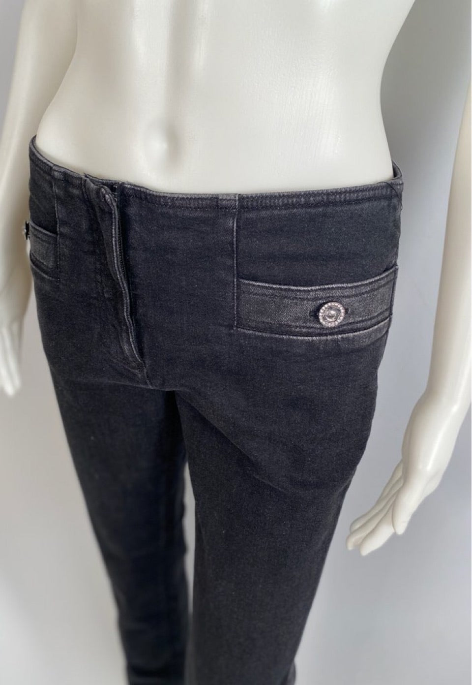 Flattering Chanel 2016, 16B Paris-Rome Metiers D’ Art Runway black skinny leg mid-rise jeans, pre-washed. There are 2 shallow pockets in the front, each with a Chanel button with crystals around the edge and a tiny CC" logo in place of one if the crystals.