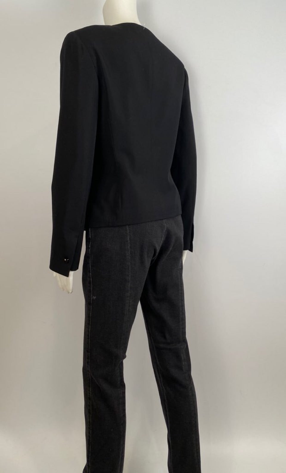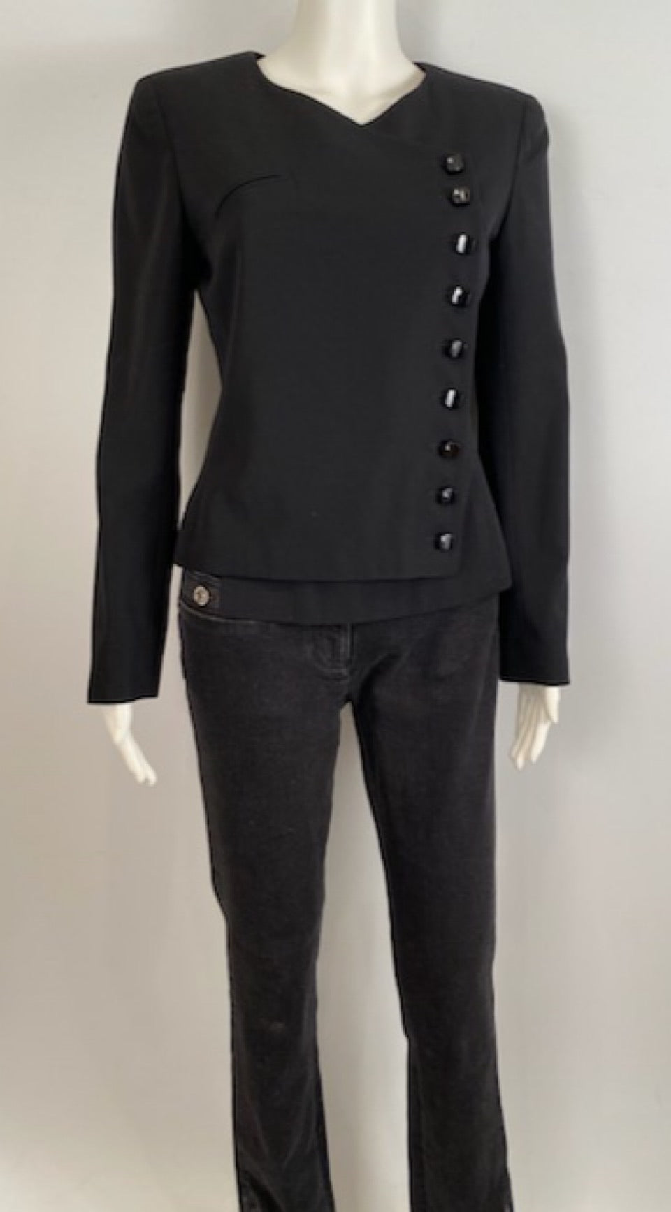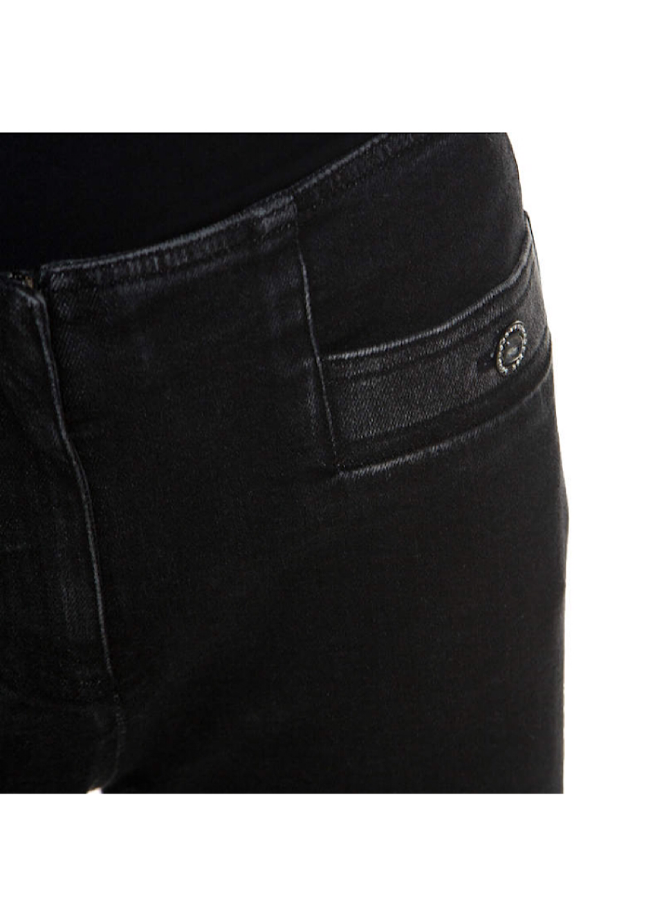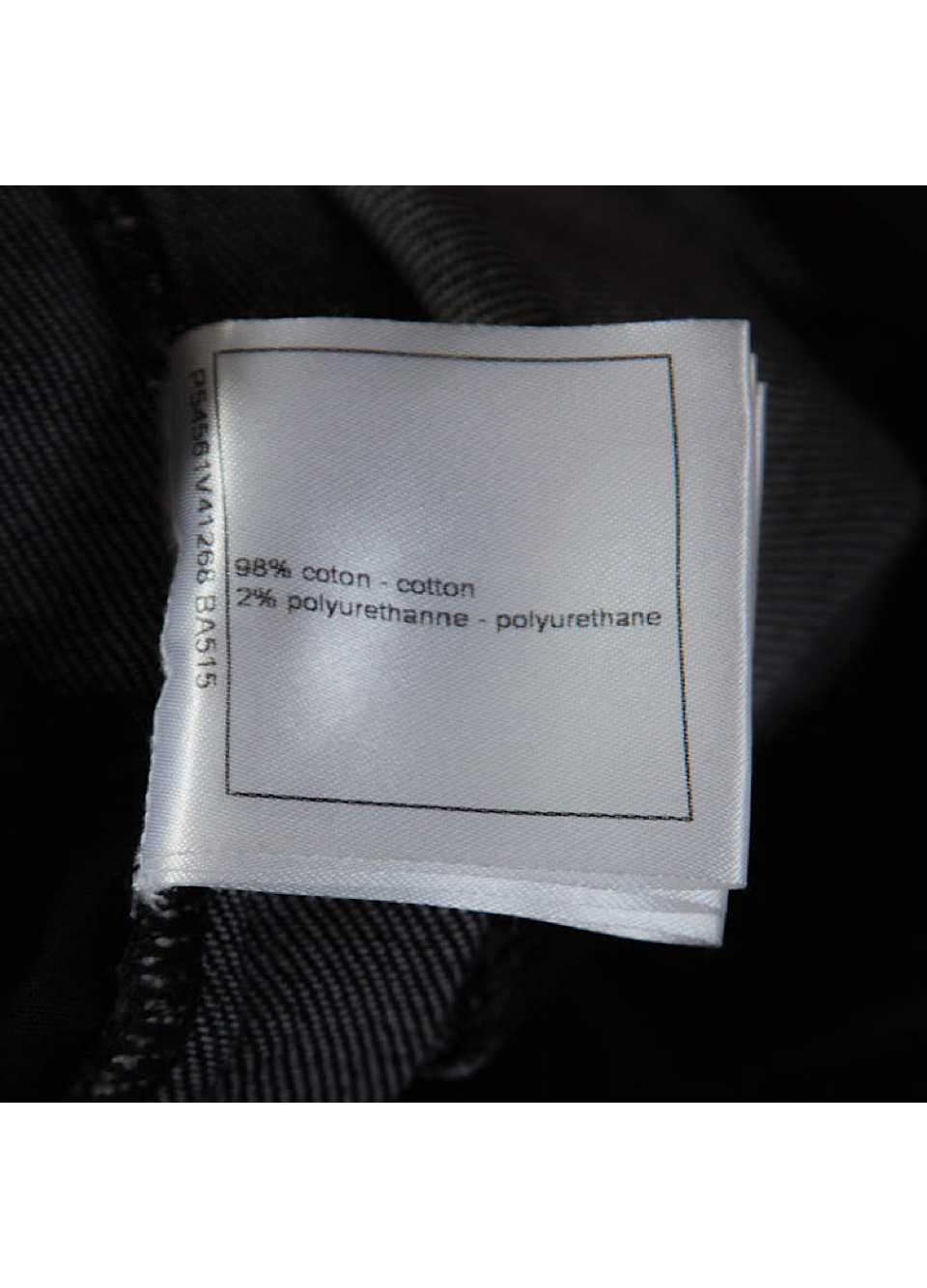 Flattering Chanel 2016, 16B Paris-Rome Metiers D’ Art Runway black skinny leg mid-rise jeans, pre-washed. There are 2 shallow pockets in the front, each with a Chanel button with crystals around the edge and a tiny CC" logo in place of one if the crystals.