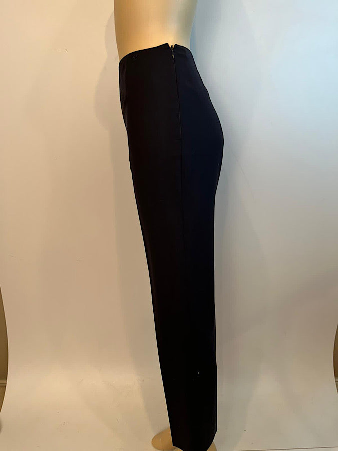 This pair of Summer/Spring Chanel pants is made of Chanel's famous lightweight wool which is smooth to the touch and as thin as fine cotton, but this does not wrinkle. Flattering style with no waistband, a hidden side zipper, tapered, creased legs. Smooth fit with no pleats, no elastic, no pockets. There is a metal "CC" logo at the waist.