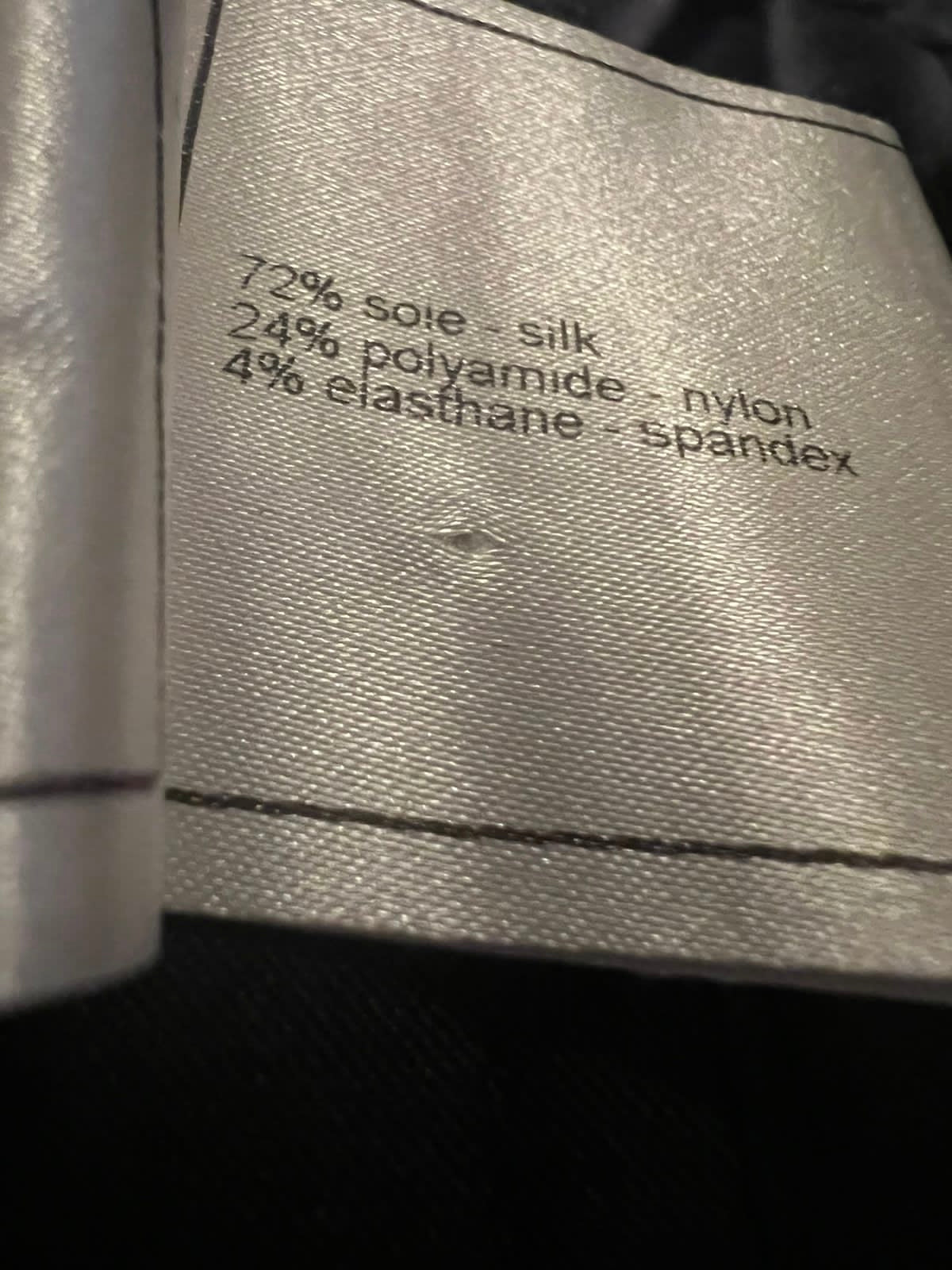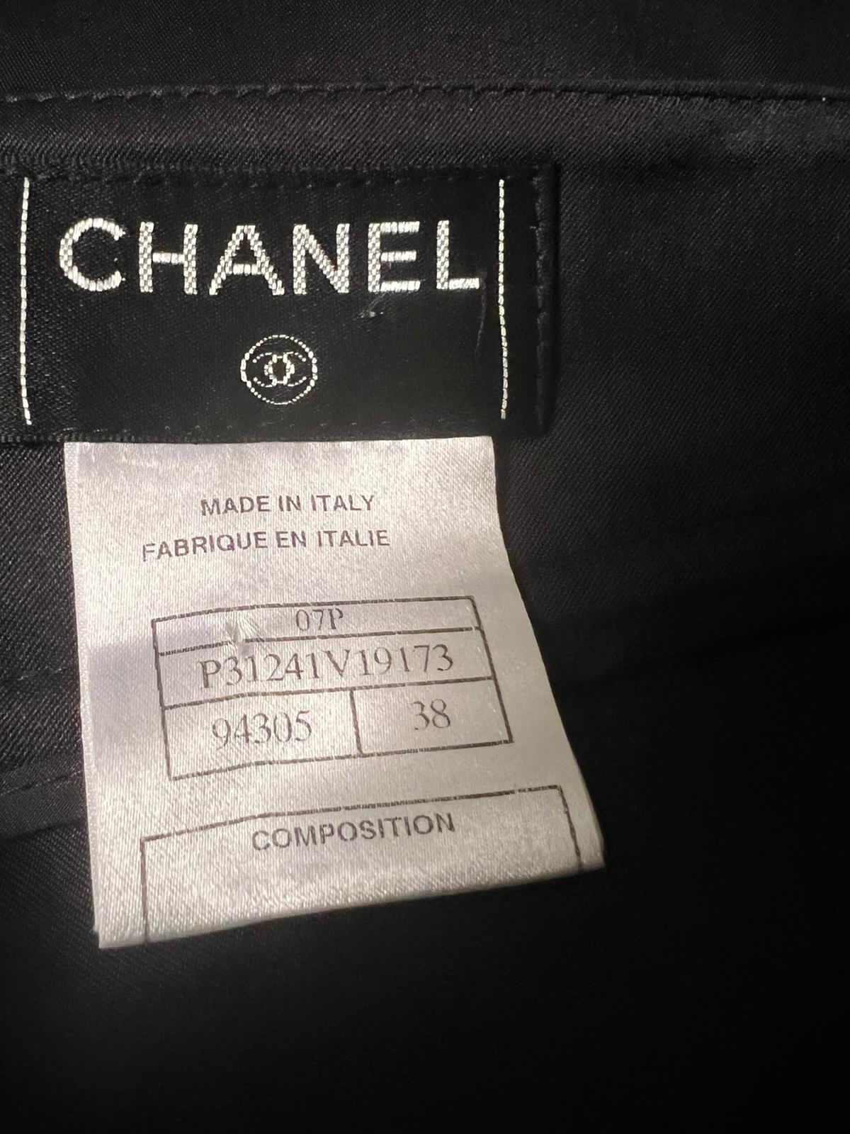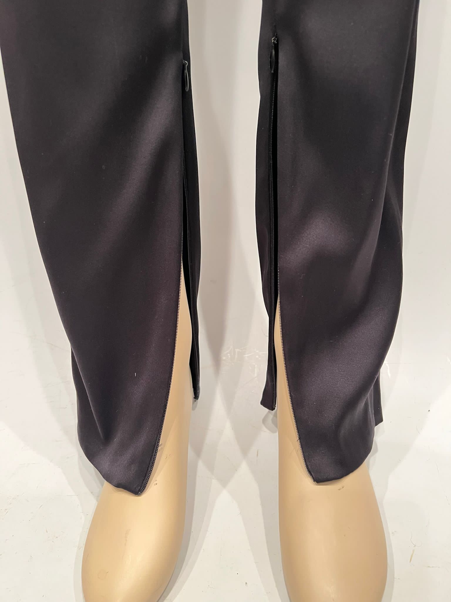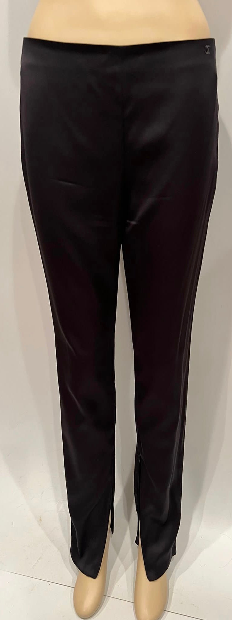 Flattering Black silk/satin low rider slim leg Chanel pants with zipper ankles. These pants are from Chanel's 07P, 2007 Spring collection. They are so flattering with no pockets, no gathers, a nice smooth fit. They zip up the back with a hidden zipper and there is an eleven inch zipper at each ankle so they will never be too long. They have a metal CC logo at the waist.