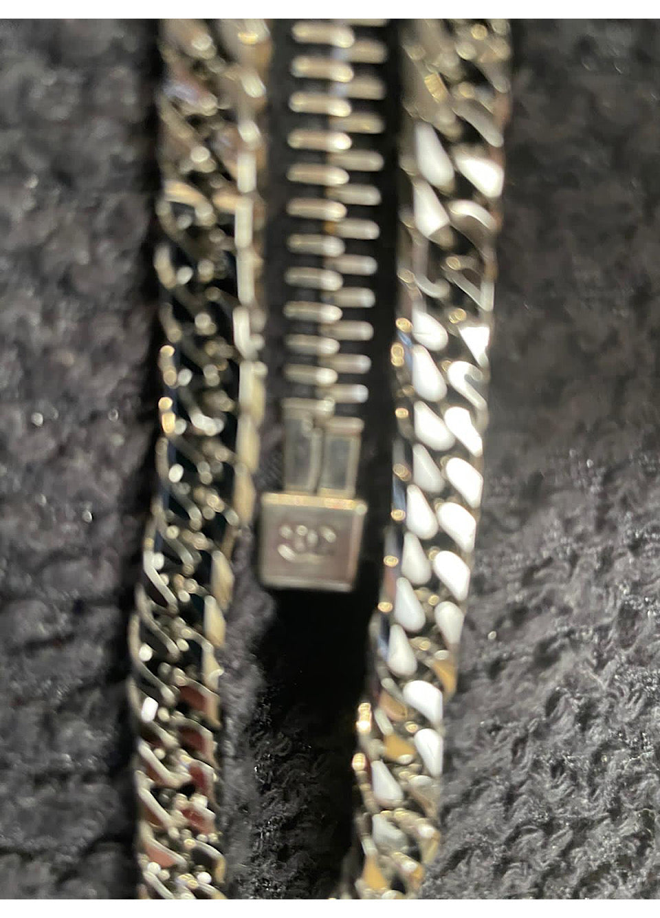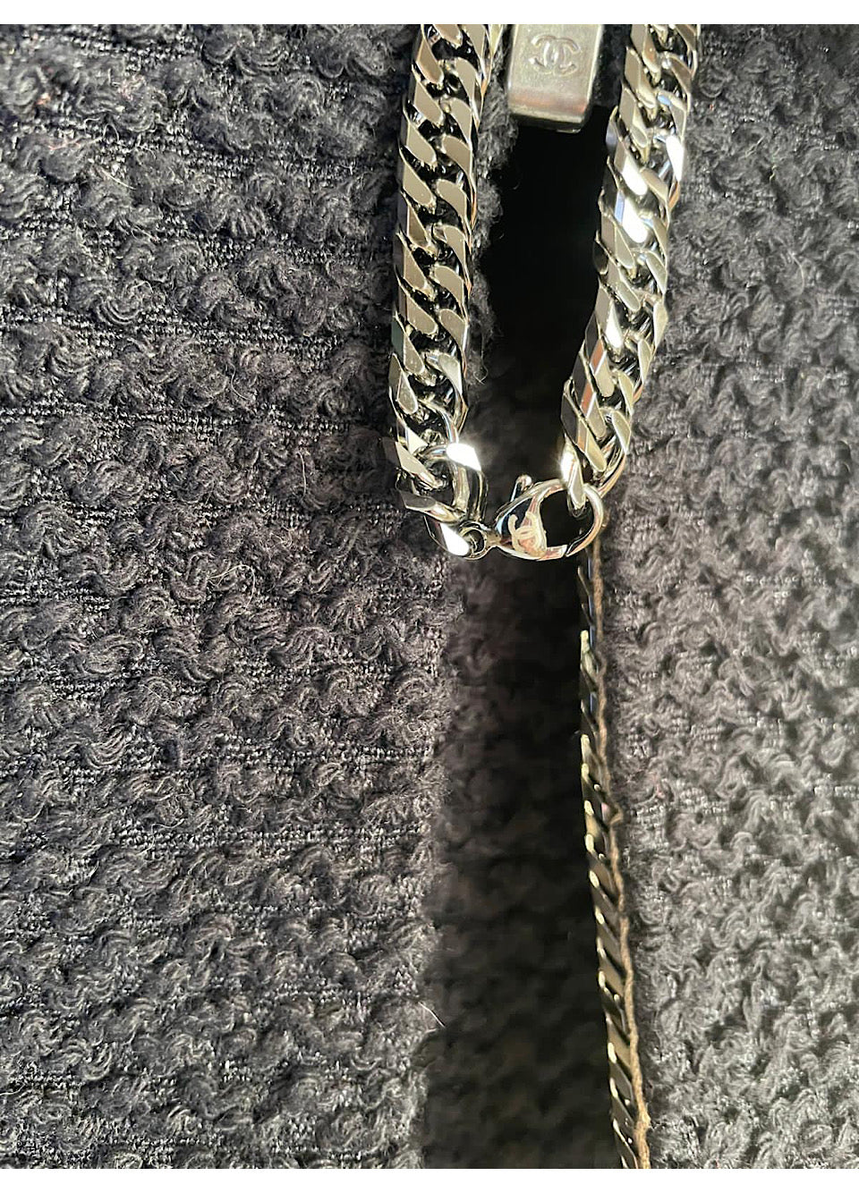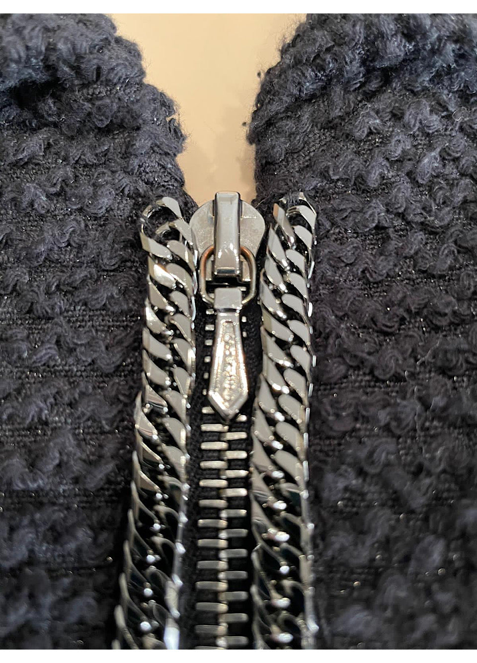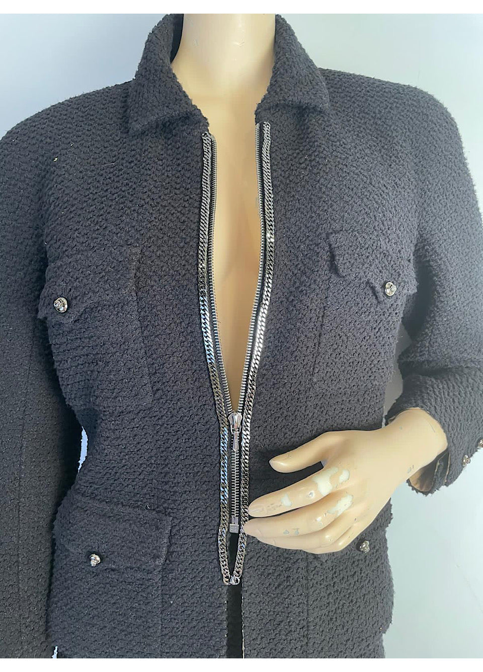 Jacket: Four Flap pockets with peaked lapels. Chain zipper detailing down centre and trim. Chanel silver button detailing on cuffs and pockets. At the bottom of the decorative zippers on the front closure you can see the end of the zipper with the CC at the top of the picture.