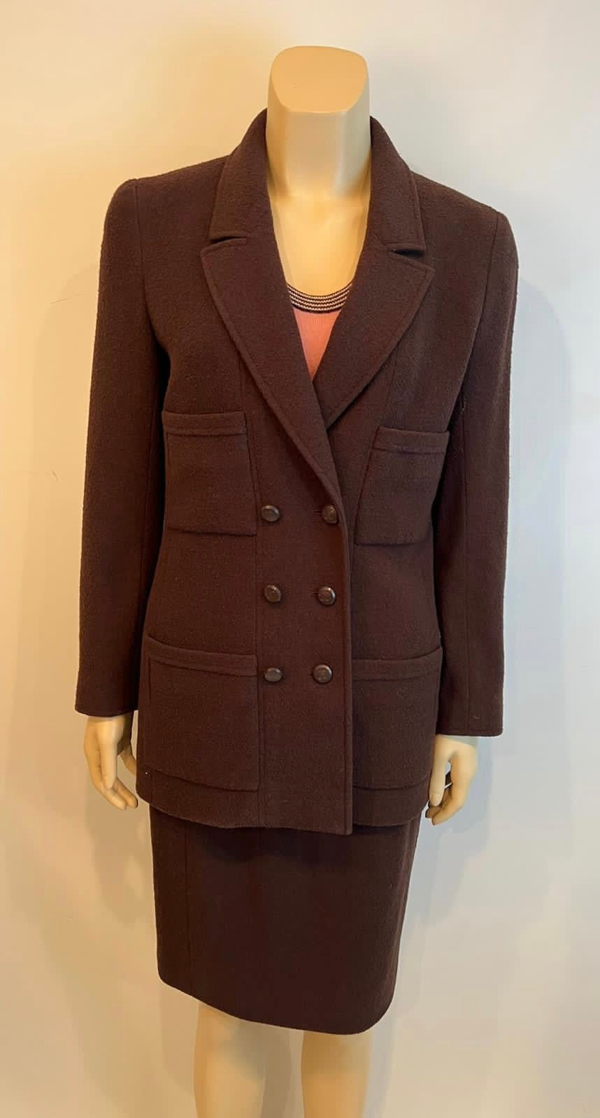 Flattering skirt with no waistband. Hidden zipper on the back with no gathers, pleats, elastic, or pockets for a nice smooth fit. The jacket is equally flattering, long and covers the hips, shallow double breasted with 3 rows of brown buttons with a large CC on each button. There are 6 additional buttons on each sleeve. There are 4 patch pockets, 2 large and 2 small. Fully lined with Chanel CC silk. Jacket has medium shoulder pads.