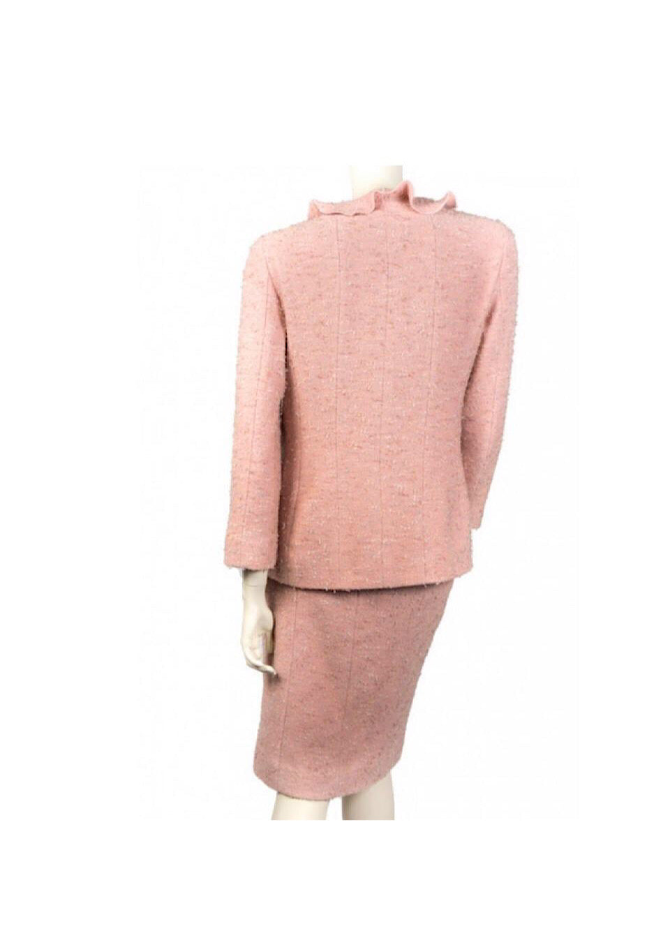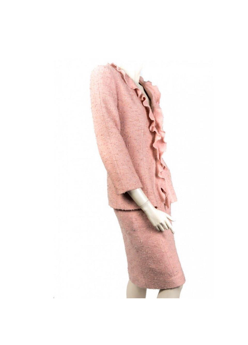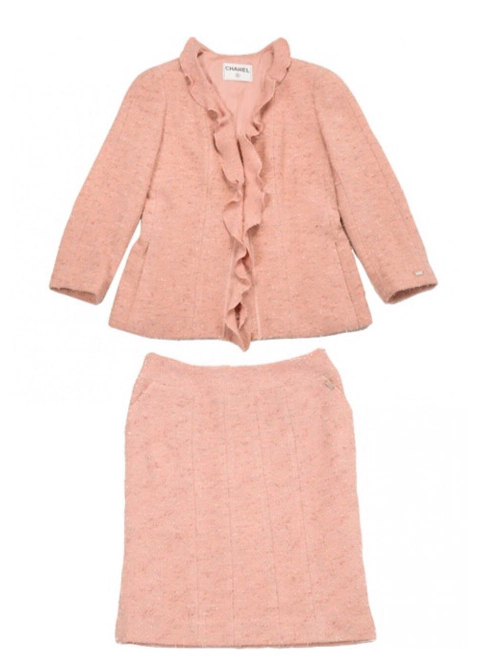 Flattering Vintage Chanel 99A, 1999 Fall Jacket and Skirt suit set in dusty pink with eyelash threads. Long jacket with scalloped ruffle fabric trim with front closure. Flattering skirt has 2 curved hip pockets, metal oval with "Chanel" on the front pocket. The jacket is a stylish long jacket, covers the hips and closure is with hidden snaps. The jacket has Chanel's famous chain around the inside bottom to make sure it hangs evenly.