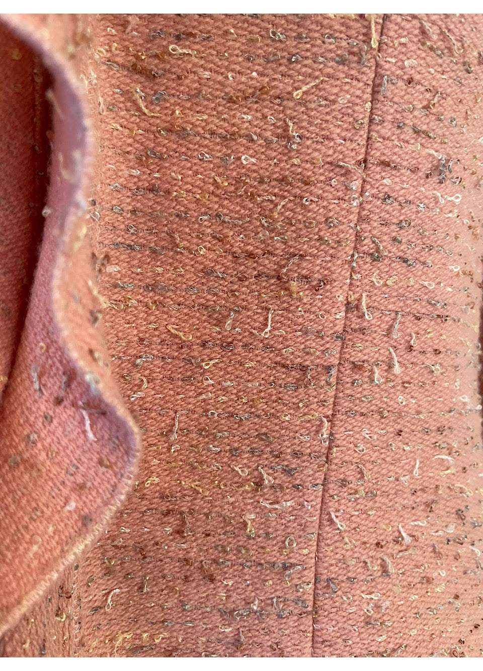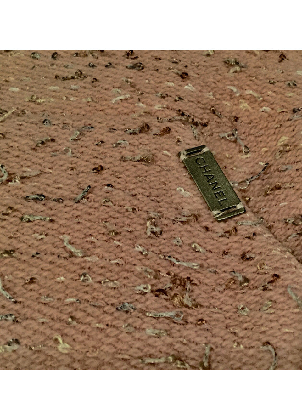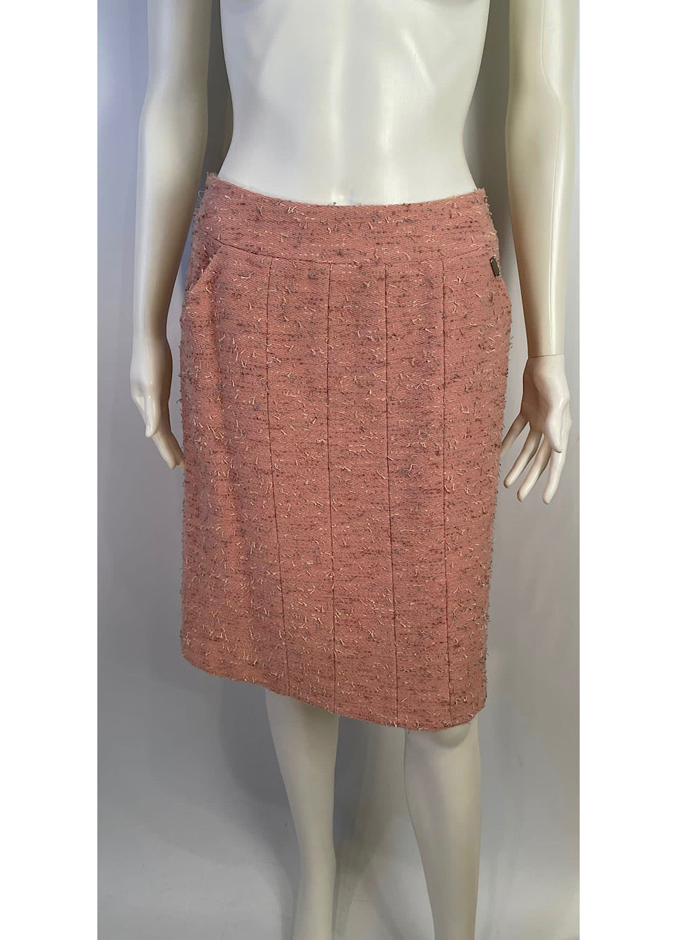 Flattering Vintage Chanel 99A, 1999 Fall Jacket and Skirt suit set in dusty pink with eyelash threads. Long jacket with scalloped ruffle fabric trim with front closure. Flattering skirt has 2 curved hip pockets, metal oval with "Chanel" on the front pocket. The jacket is a stylish long jacket, covers the hips and closure is with hidden snaps. The jacket has Chanel's famous chain around the inside bottom to make sure it hangs evenly.
