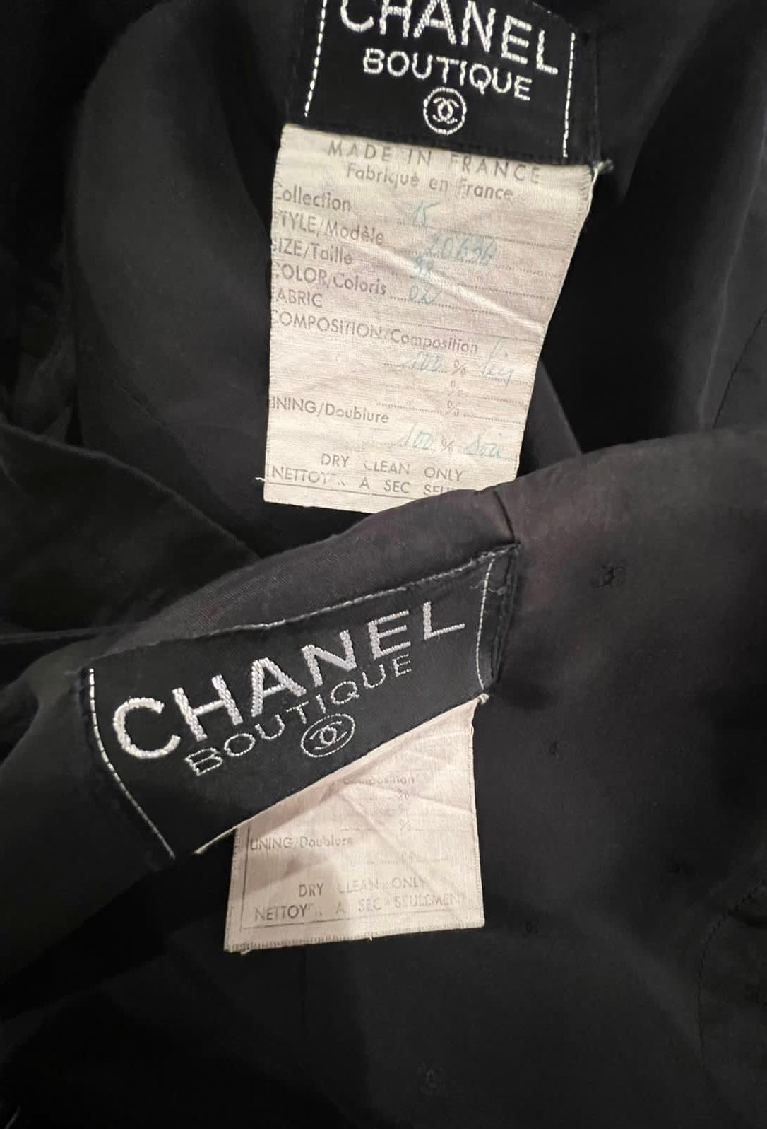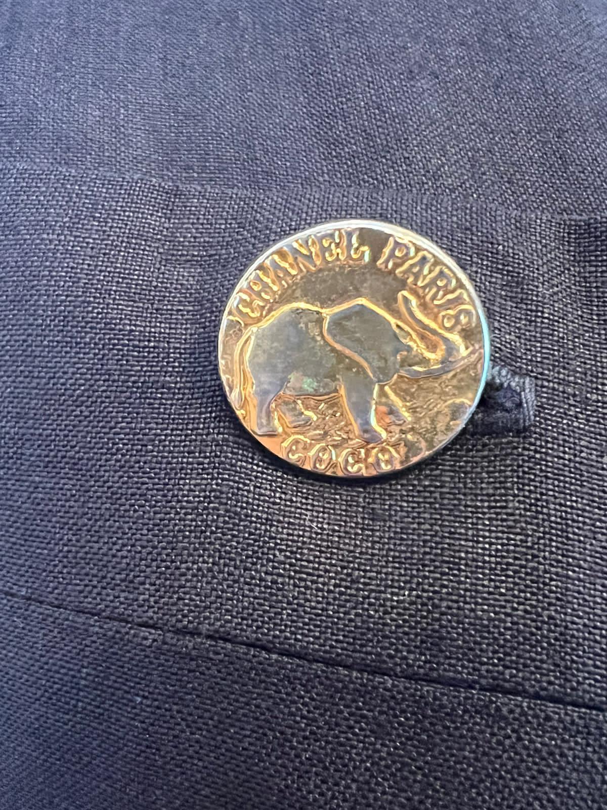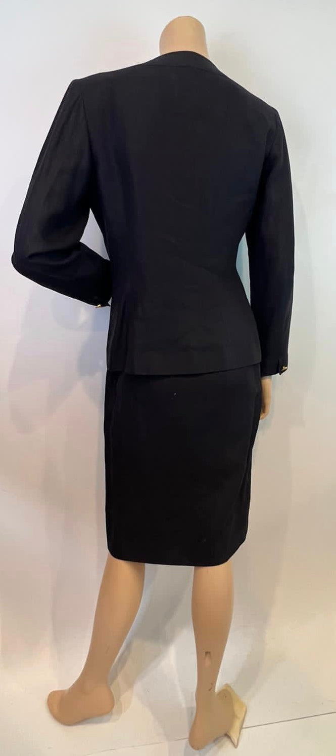 Vintage Chanel black linen skirt suit from the late 1980's (Collection 15) with 9 rare Chanel elephant buttons! There 5 for closure, 1 on each sleeve, and 1 on each of the patch pockets on the front of the jacket. Round collar jacket that covers the hips, skirt is straight and fitted.
