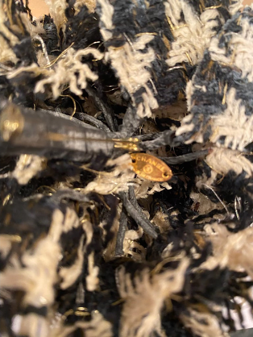Large Black and Ivory Chanel flower pin. 4" across, this Chanel pin will always hold it's shape because it is stiff by design, you can rearrange them point the two attached leaves however you think they look best. Versatile and showy! The gold Chanel hangtag is attached on the back, typical