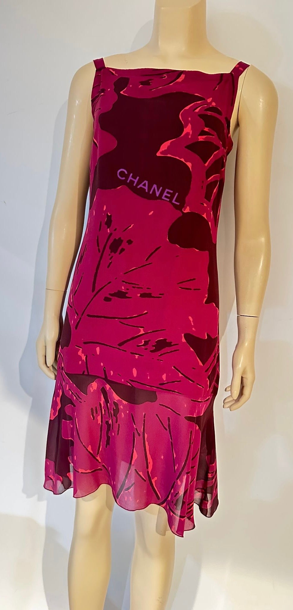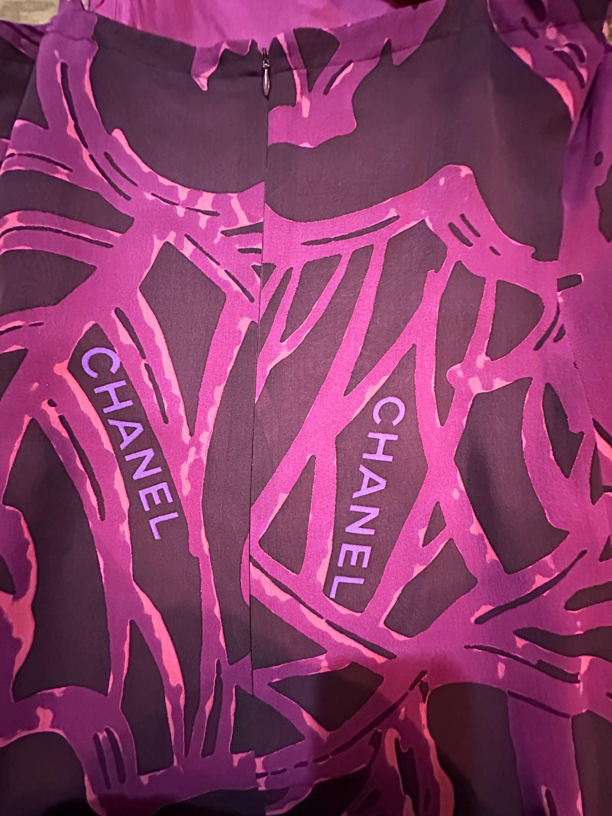 This Chanel summer dress has 3 nice big "Chanel"s approximately 5 1/2" long spelled out in 3 places in the fabric. This collection was referred to in a Vogue Magazine as “the season of the lady..one who had polish.." it is lined down to the top of the bottom ruffle. It is a soft silk dress not as thin as chiffon.