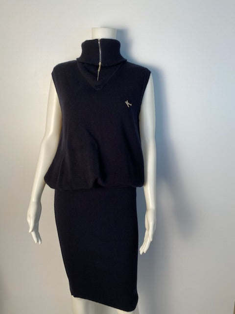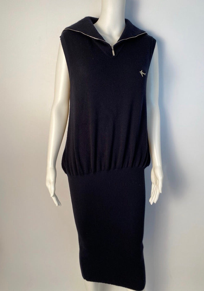 This is stretchy, skirt is ribbed, as is the collar which can be worn 3 different ways as shown. The top can be pulled up Blouson style, or it can be pulled down for a sleeker look. The zipper pull has a CC logo. And there is a metal airplane 1 1/4" long which has the word "Chanel " on top.