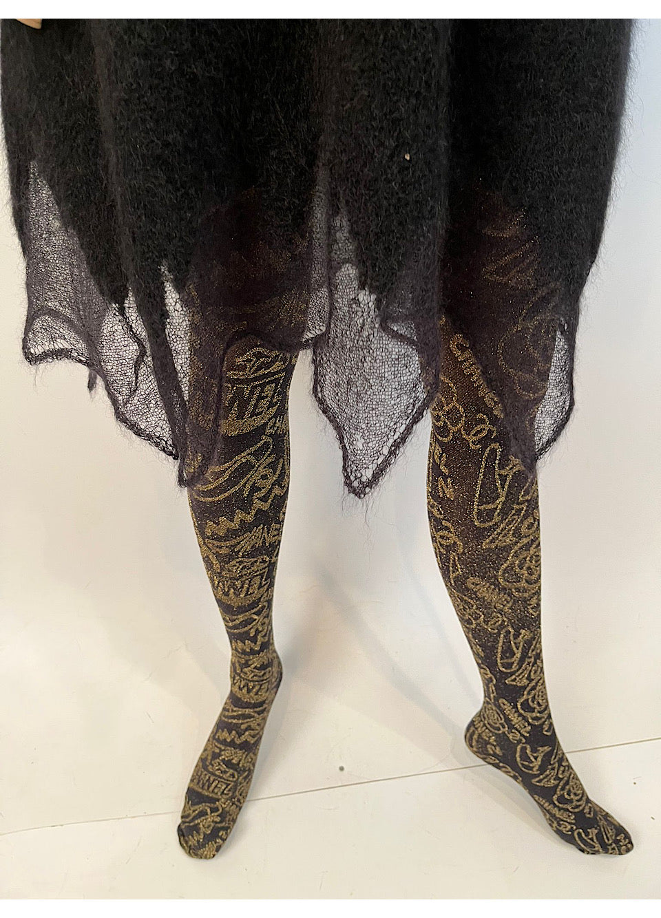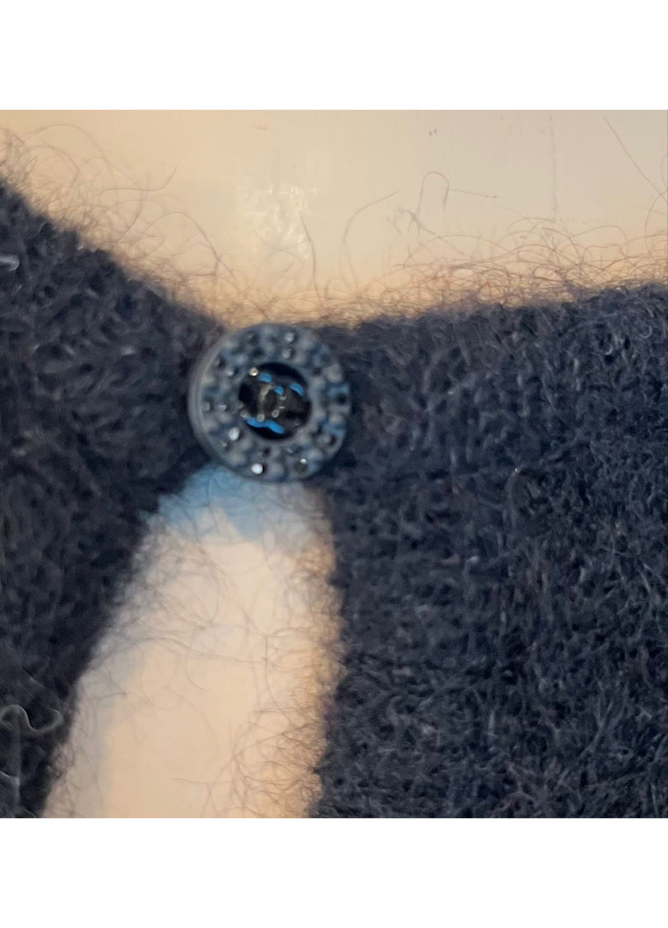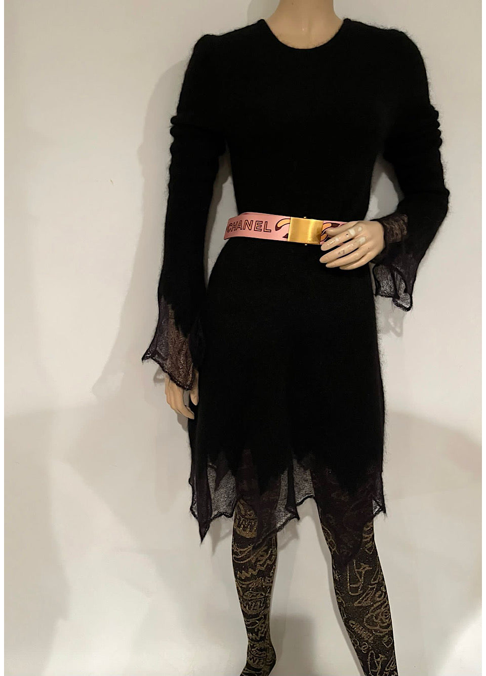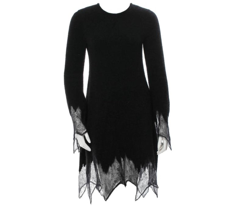 This is perfect dress for cool/cold weather. Soft black long sleeved sweater dress with lacie pointed scalloped design at the wrists and hem, keyhole closure at the back of the neck, fastening with a small black button with the CC logo surrounded by tiny black faceted crystals.