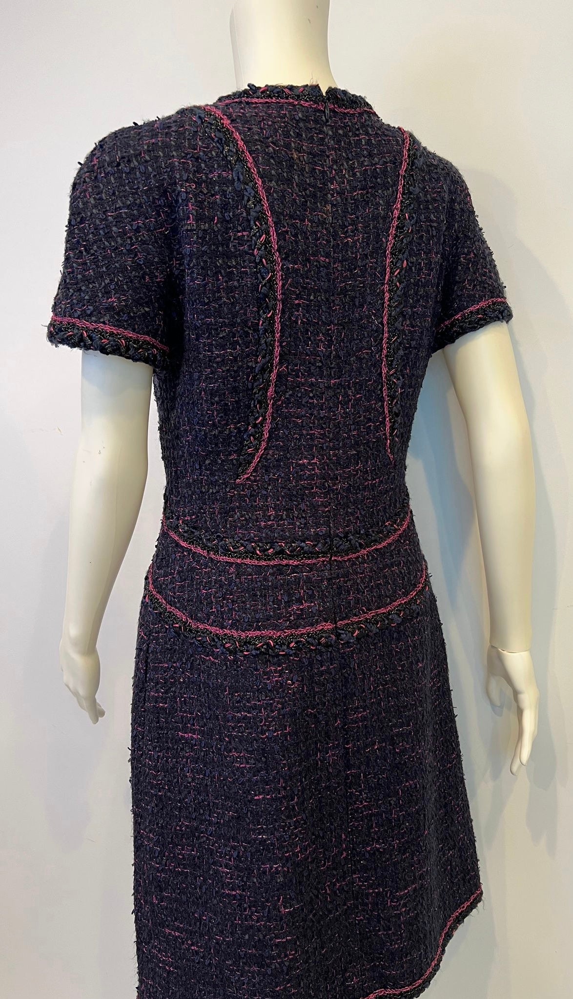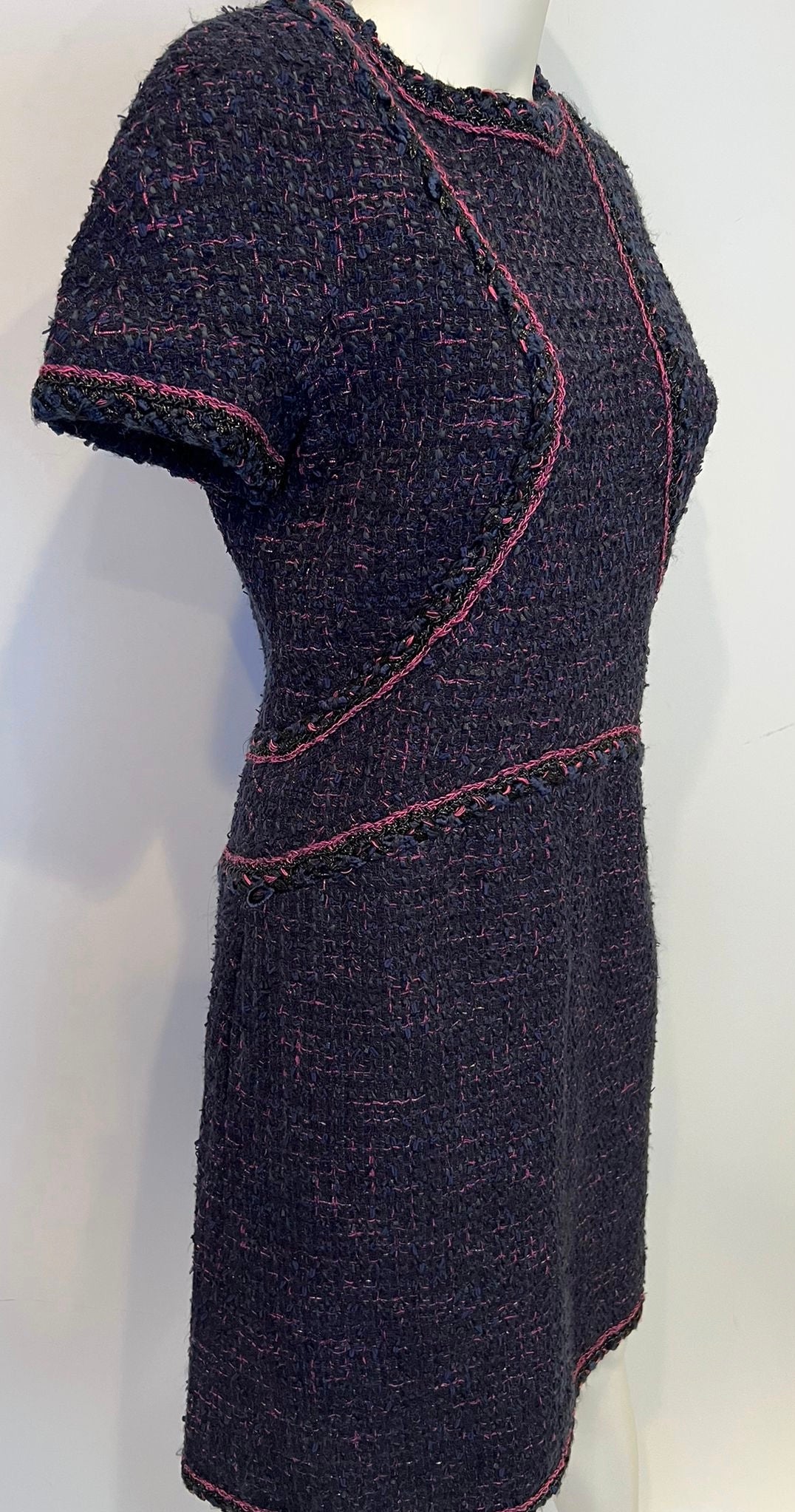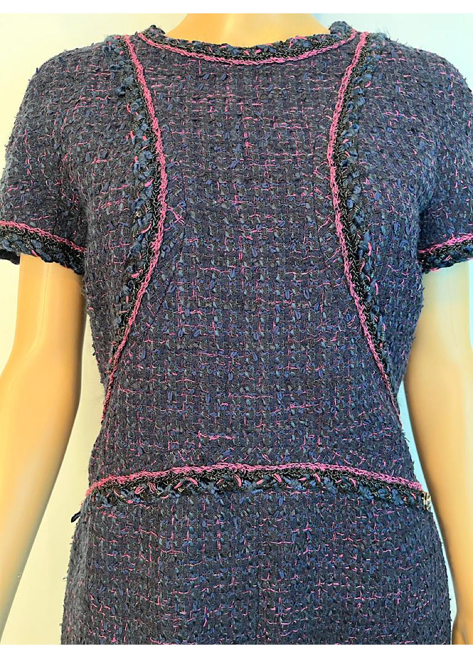 Chanel dress navy and pink tweed with tiny chain in the trim. This dress has a textured fabric, woven with differing sizes of navy ribbon, and tiny pink cording, resulting in an interesting mixed texture some eyelash effect, some loops, and tiny black chain in all the trim. There is a black enamel oval with a CC logo made from tiny silver chain.