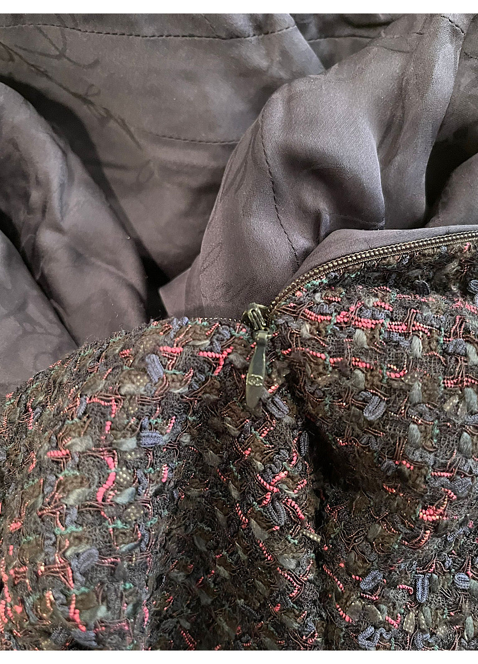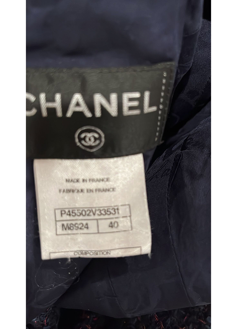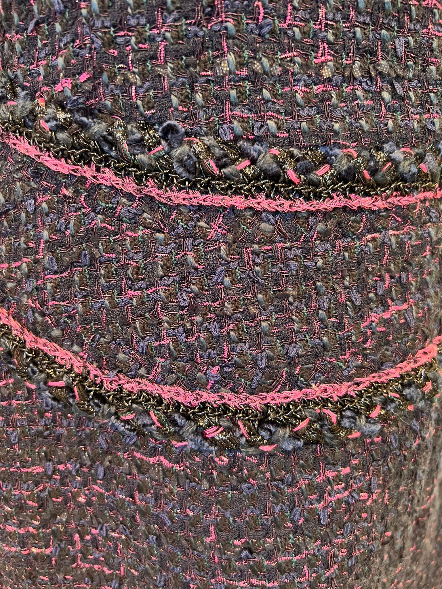 Chanel dress navy and pink tweed with tiny chain in the trim. This dress has a textured fabric, woven with differing sizes of navy ribbon, and tiny pink cording, resulting in an interesting mixed texture some eyelash effect, some loops, and tiny black chain in all the trim. There is a black enamel oval with a CC logo made from tiny silver chain.