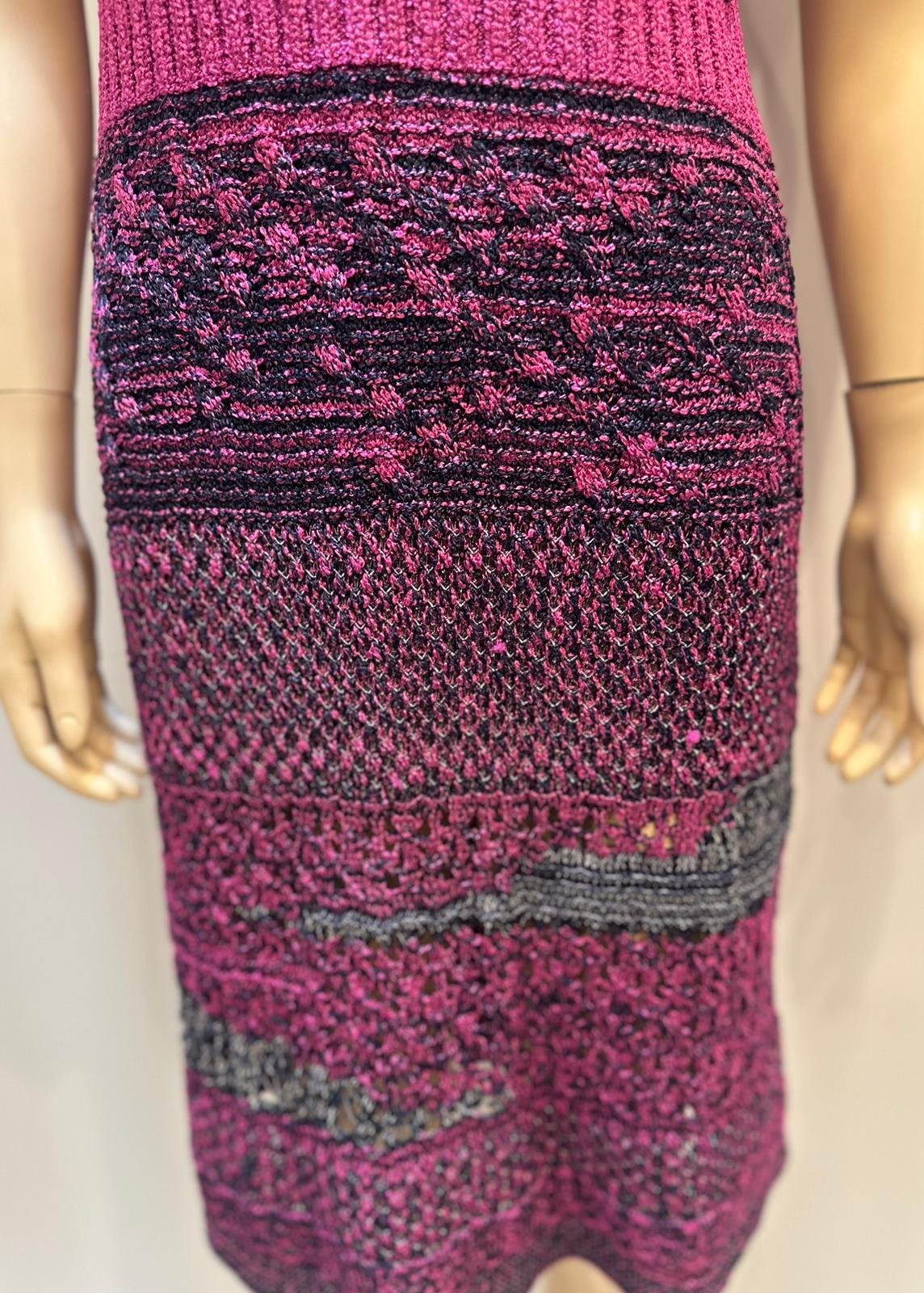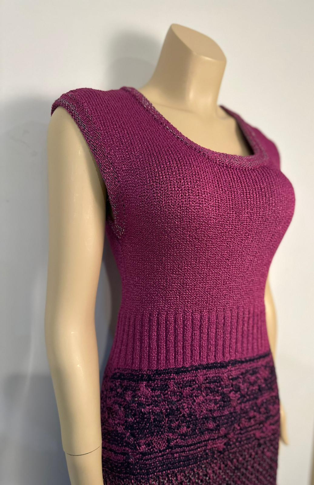 Chanel Raspberry Knit Dress. It is unlined so it can stretch. It has a low round neck, top half has ribbing at the waist, looks almost like a sweater and skirt but it is a one piece dress. Sleeveless and stretchy. The color is raspberry on top, the bottom half is a mixture of raspberry, some silver, black, and navy. There is a metal oval at the waist which has a large CC logo in silver. Because it is a loose knit at the bottom, I have it shown in some pictures with a dark half-slip underneath. condition is perfect.