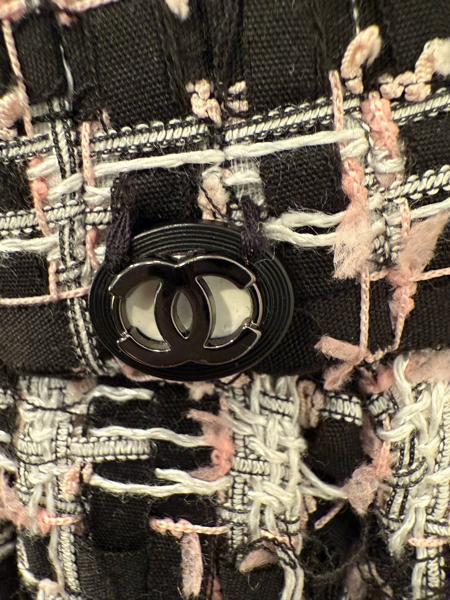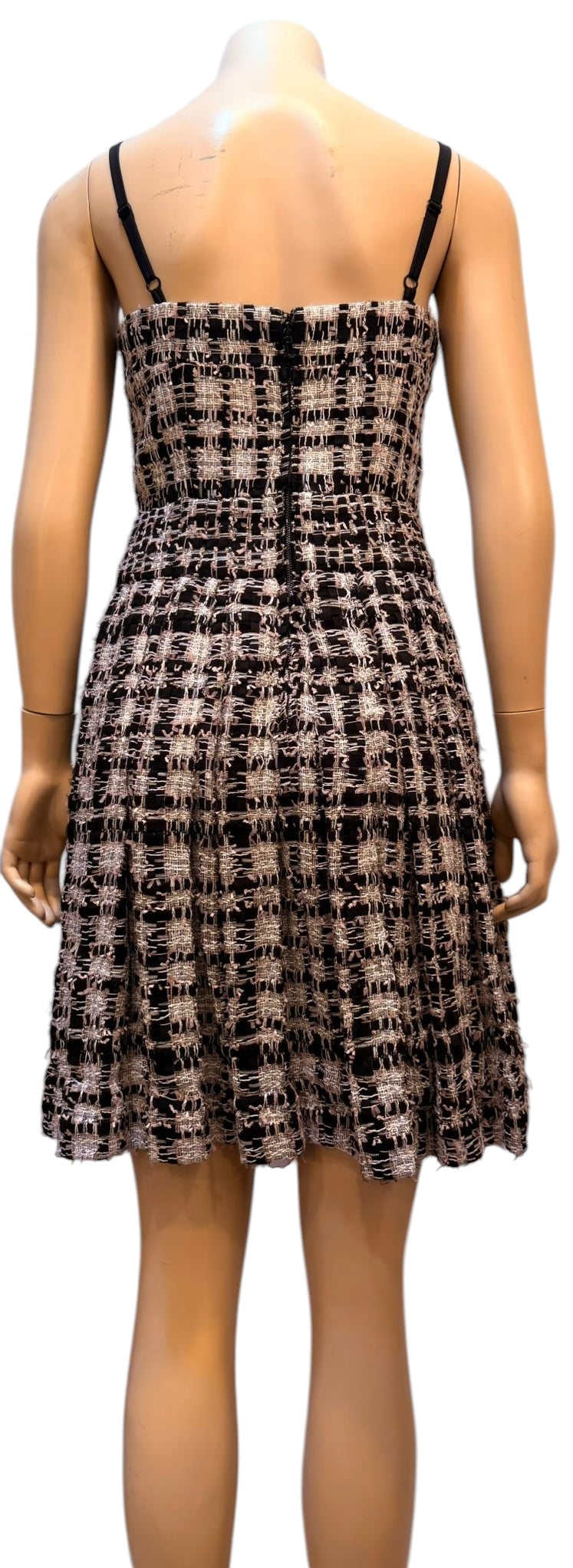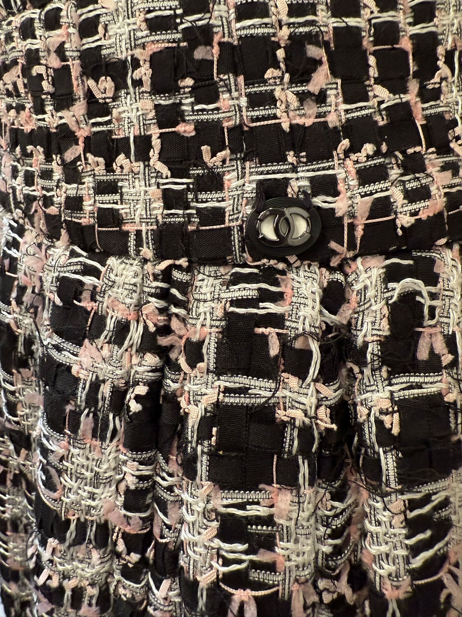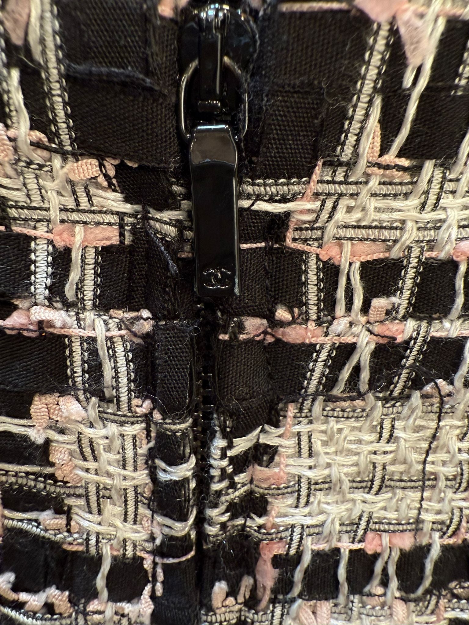 From the Chanel 2020 Spring Campaign ad. This is a beautiful plaid pink, black, and white dress fully lined with silk. There are little pink satin ribbon pieces showing, eyelash style. The attached camisole top is beautifully lined with CC Silk, black silk straps, and "stays" hidden in the lining, to help hold the top in position. It zips up the back with a "CC" logo. At the waist is a black metal oval CC logo. Retail over $7.5k