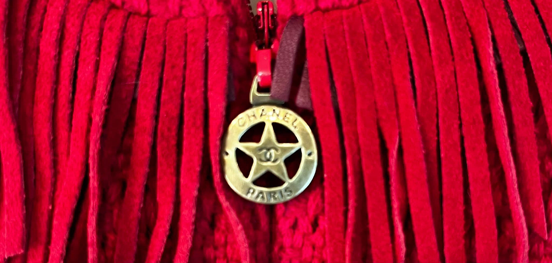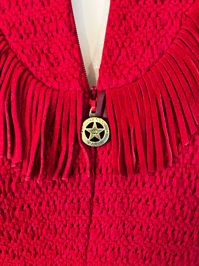 This dress has a slightly Western theme with leather fringe and a zipper pull that is a open round metal circle that says "Chanel Paris" and a star in the center with a "CC" logo. Fully lined with Chanel silk.