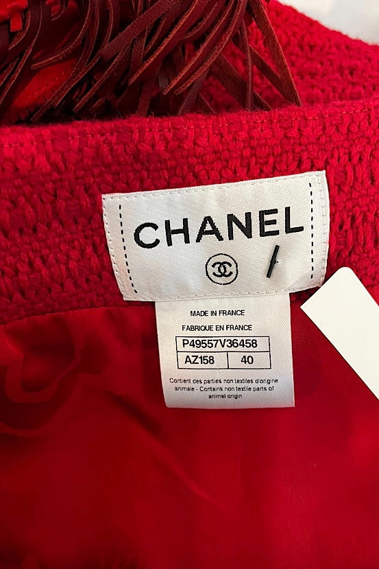 Chanel textured wool sleeveless sheath dress with red and maroon leather fringe trim. From the 14A 2014 Fall Paris-Dallas Runway.