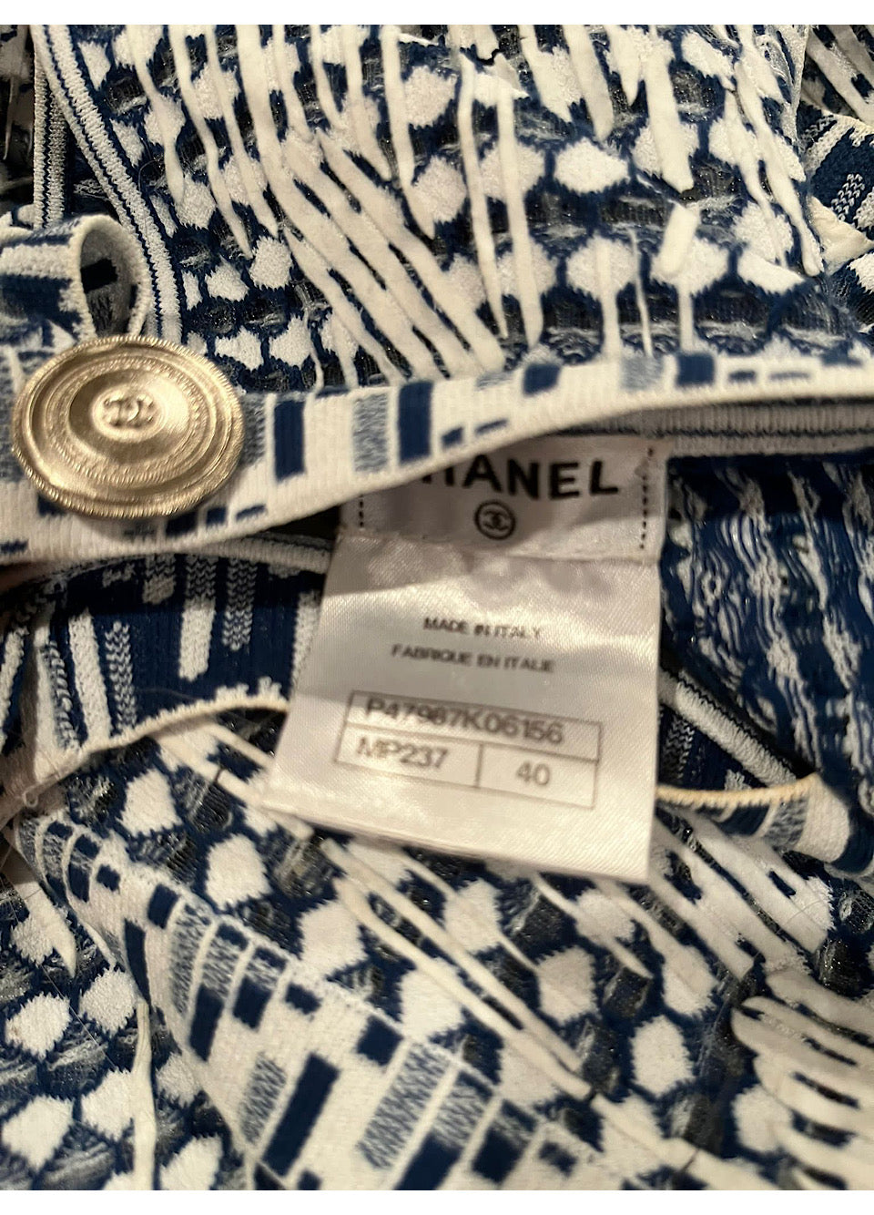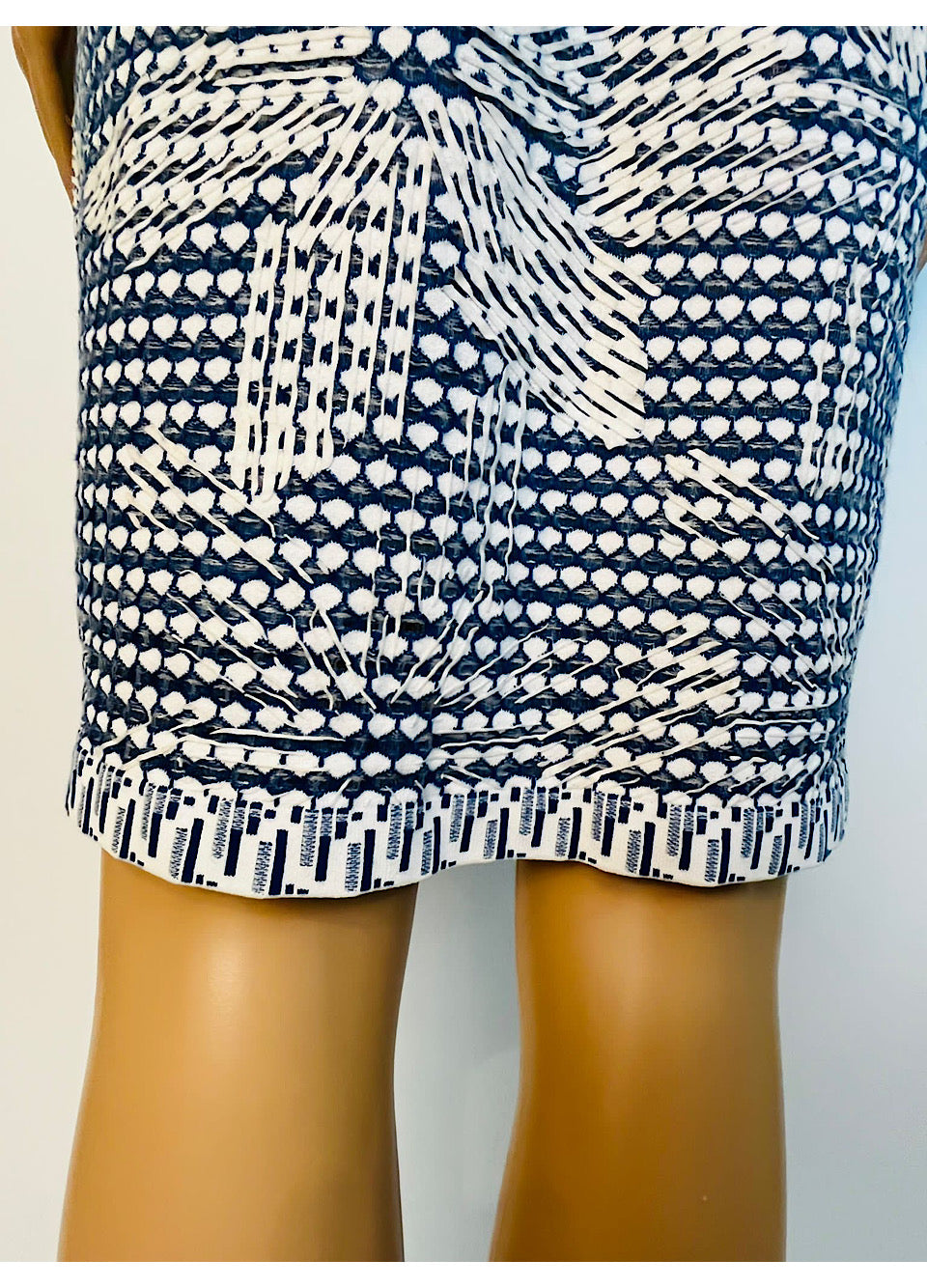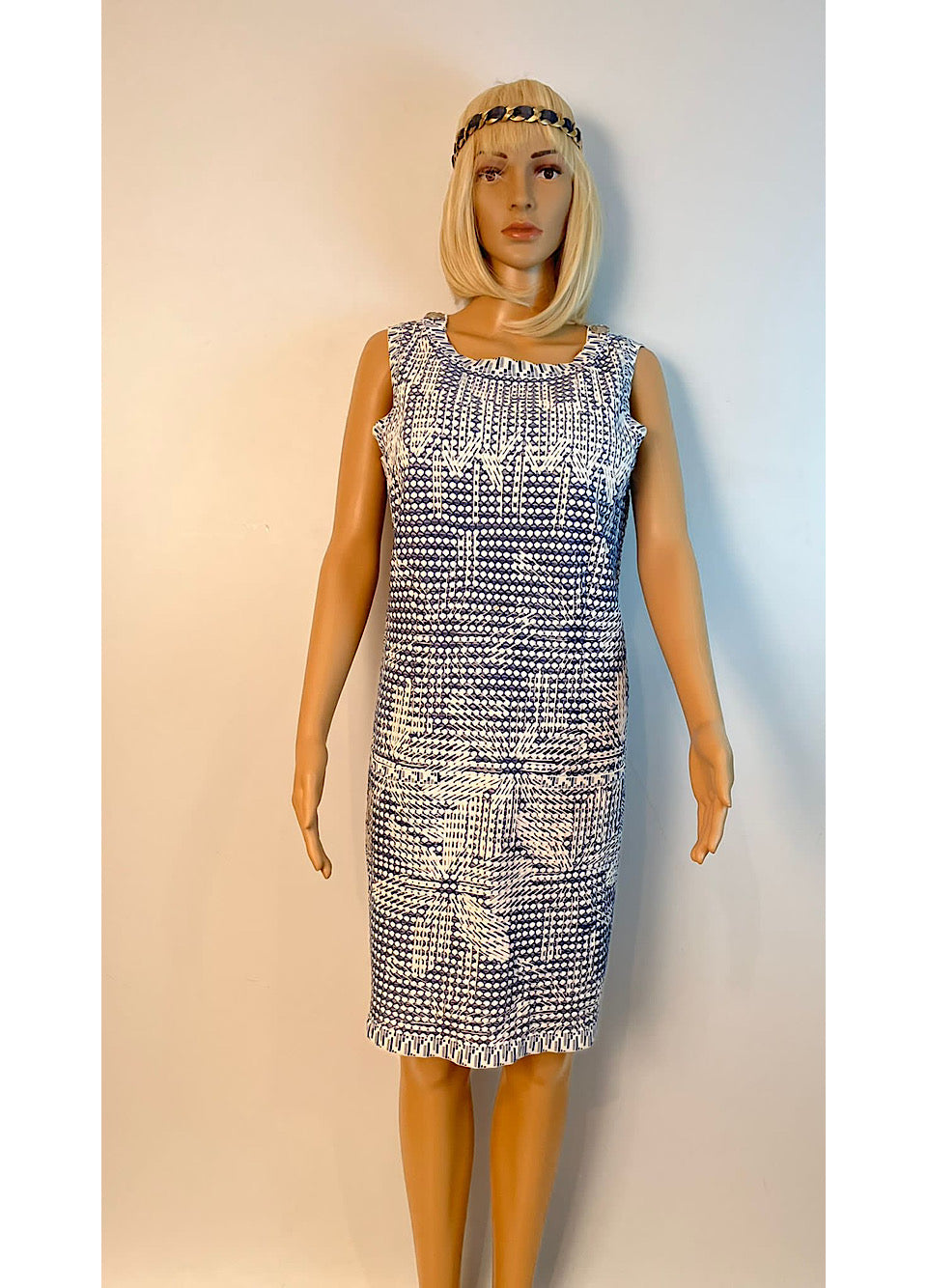 Medium weight Chanel navy and white dress with a contemporary geometric patterned fabric. The label does not tell us the year, approximately 2014 Collection.
