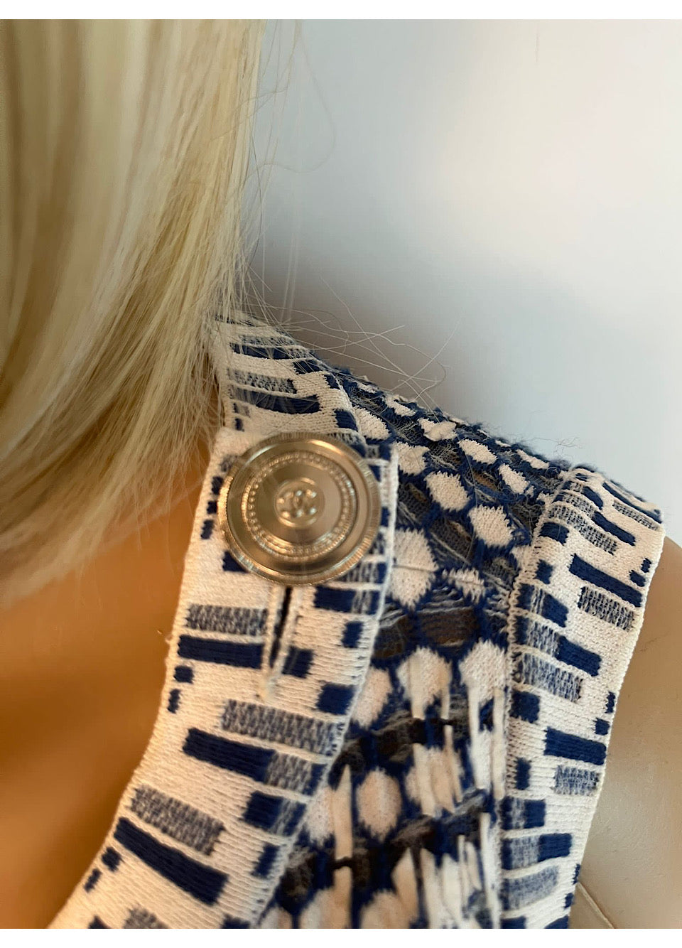 This fabric has many rows of small 6 sided shaped filled fabric with an almost invisible netting, which accounts for the nylon in the fabric. It is a slightly stretchy sheath style, easily gives a different look with belt and accessories. It fastens at each shoulder with a large Chanel logo button. There is a keyhole opening at the back with a decorative button at the neckline.