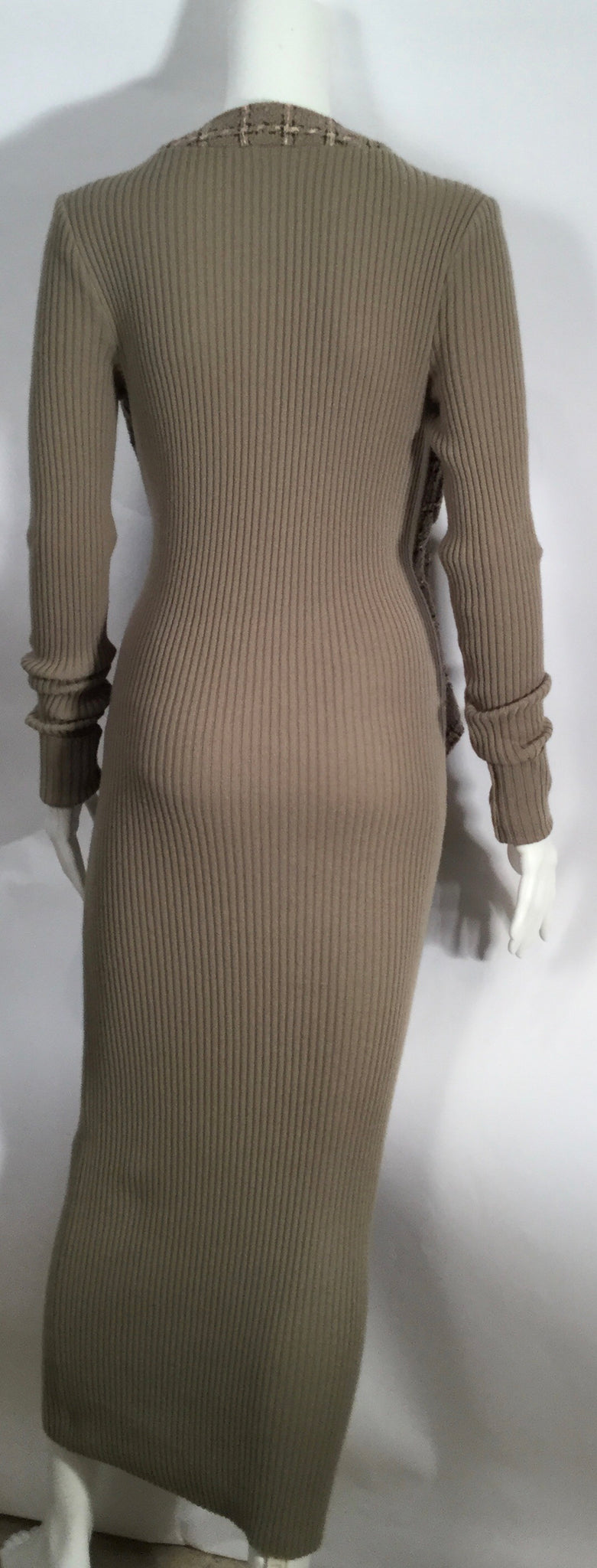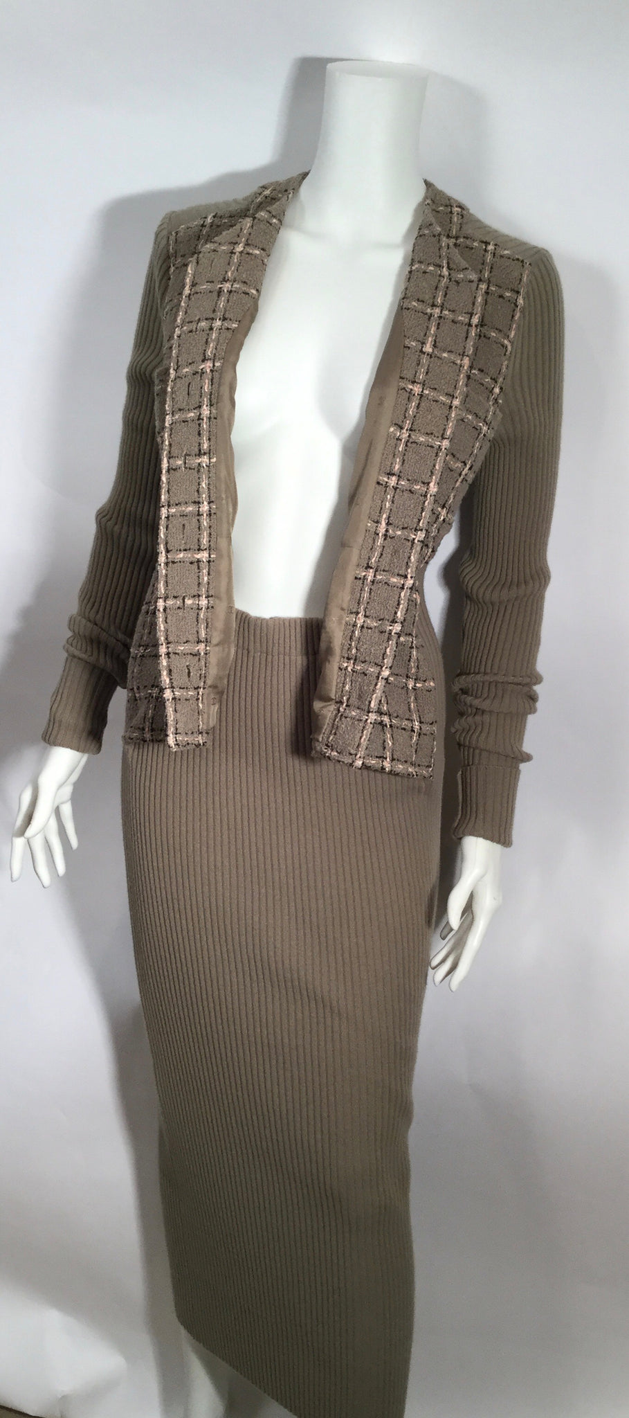 This is a Chanel collector's dream as seen on Claudia Schiffer in the 1995 Chanel Catalog, hard to find! It was featured in the Chanel Boutique hardcover Catalog for the 95A collection. It is a long knit ribbed dress with a tweed boucle button jacket front attached, with ribbing on the skirt and sleeves. There are 9 Chanel buttons with raised gold "CC". Overall color-light brown, vest front has 1 1/2" squares, delineated by pink and black stitching. Since it is ribbed, you can pull the dress portion up, for a shorter skirt.