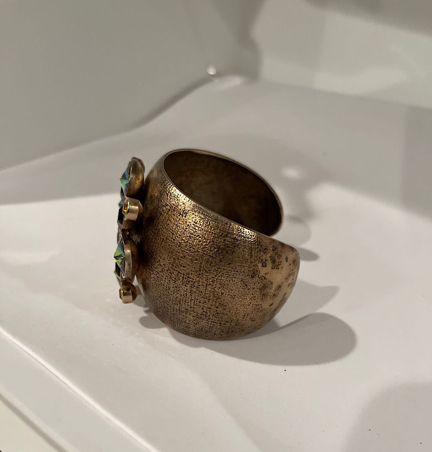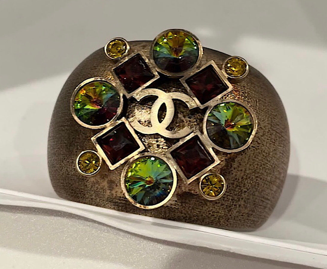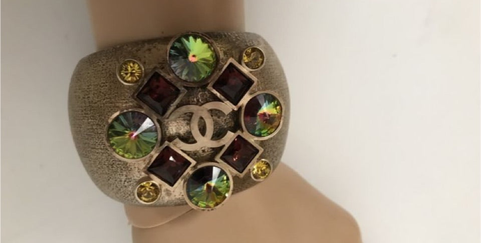 Gorgeous Chanel heavy brushed gold metal jeweled cuff bracelet with Multicolor stones.