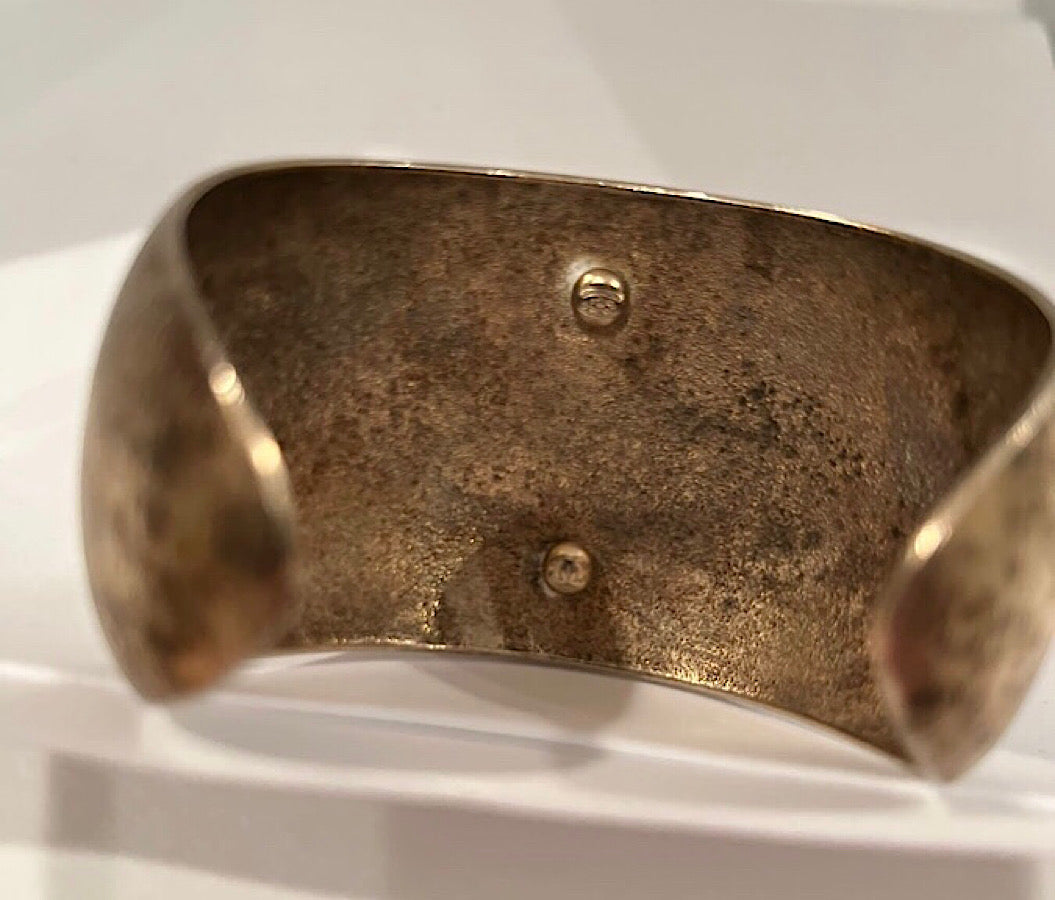 Features translucent gems in yellow, green, and purple with interlocking CC at center. Slips onto hand. The identification oval is tiny-sitting on the back of one of the screws. It is a heavy bracelet, 5 oz. and cannot be squeezed tighter to fit your wrist if it is too loose. The jeweled piece is bolted to the cuff.