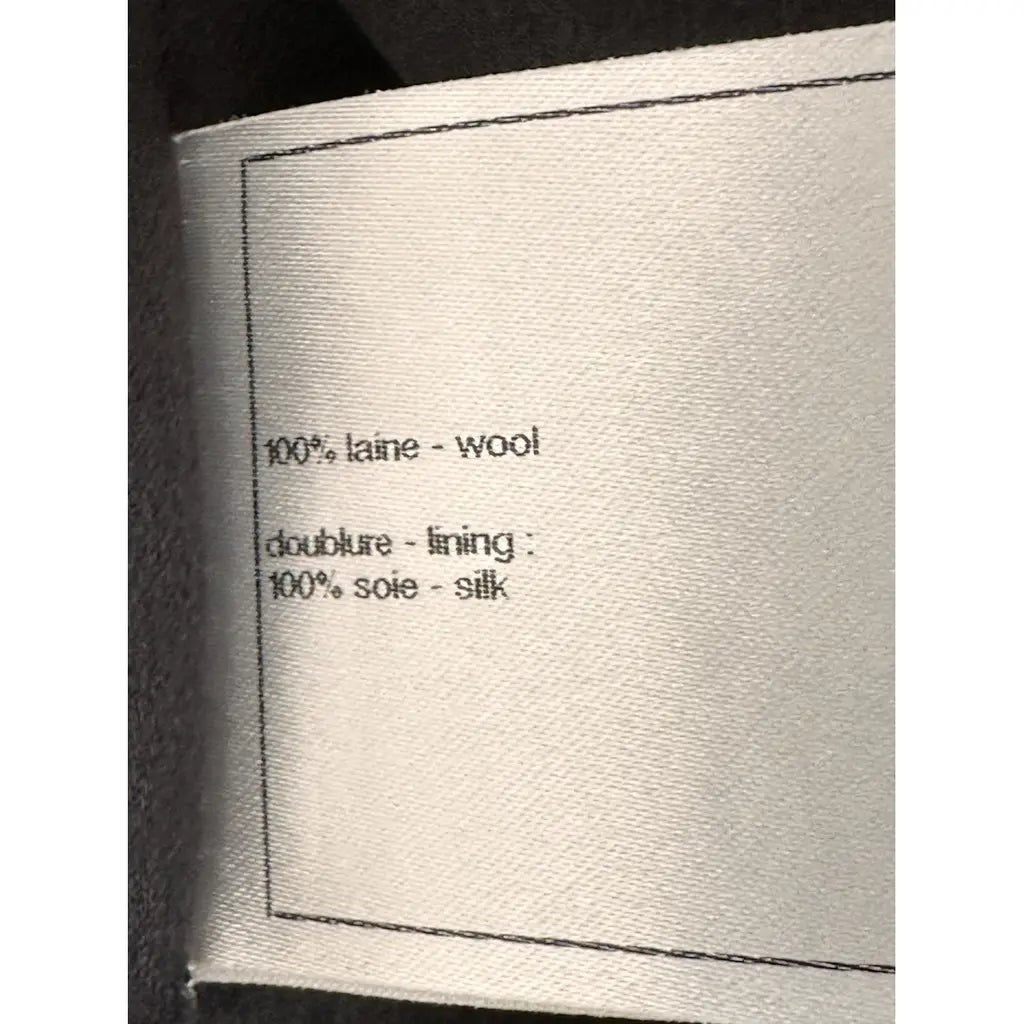 There are 3 rows of decorative Chanel buttons 2 each row, with CC logo. The front fastens with hidden buttons. It is 100% wool with silk-satin lining. It has a textured weave -and is medium weight.