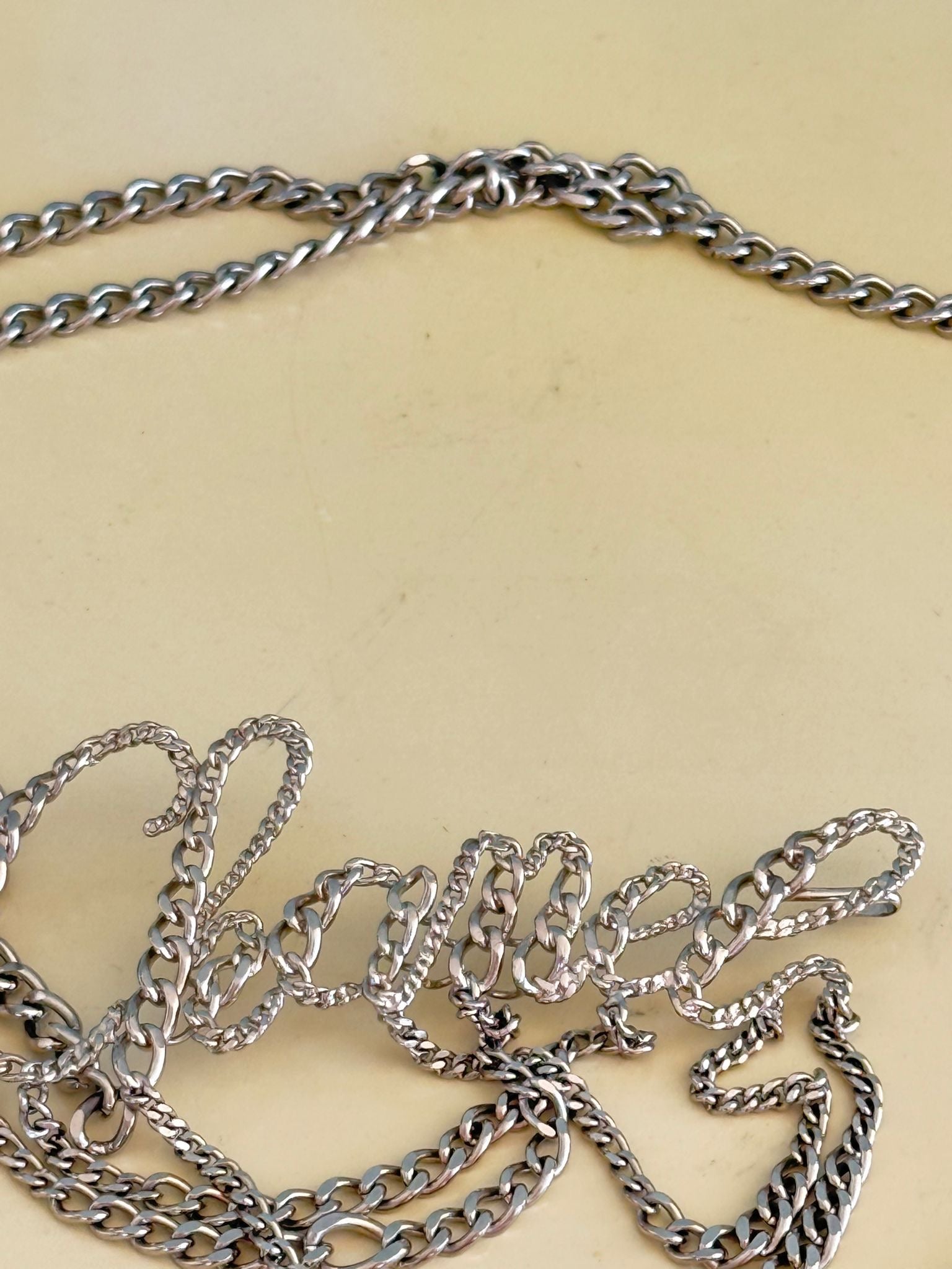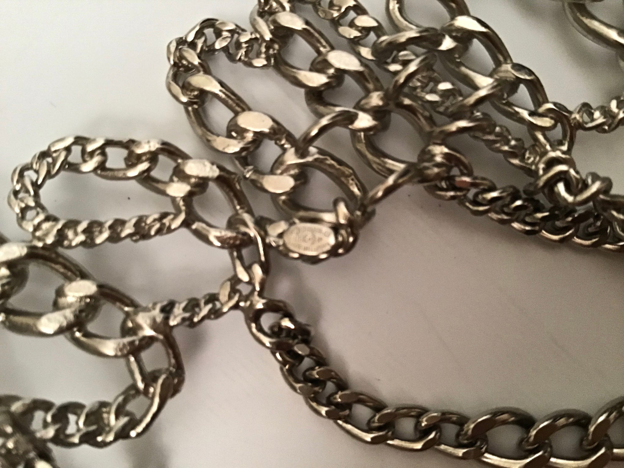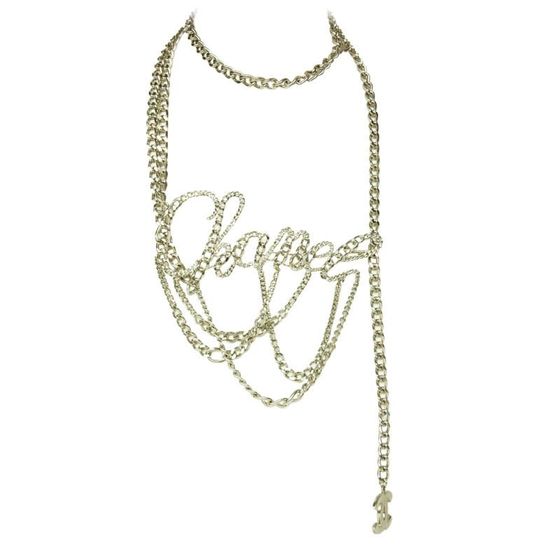 This is a fabulous Chanel 06C, 2006 Cruise Resort collection rare SILVER Tone belt/necklace. It is very versatile and can be worn as both . It is made with 4 different size chains, which form the word "Chanel", in cursive, having loops of chain hanging below with a 5" drop. The identification oval is on the back, identifying it as an 06P piece. It was sold out right away, and was pictured prominently in the Chanel catalog in numerous photos. The word "Chanel" is over 5" long, the total 38" belt length is a medium sized chain, ending with a "CC" logo at the end, 1 1/2" by 1". Fits up to a 36” Waist.