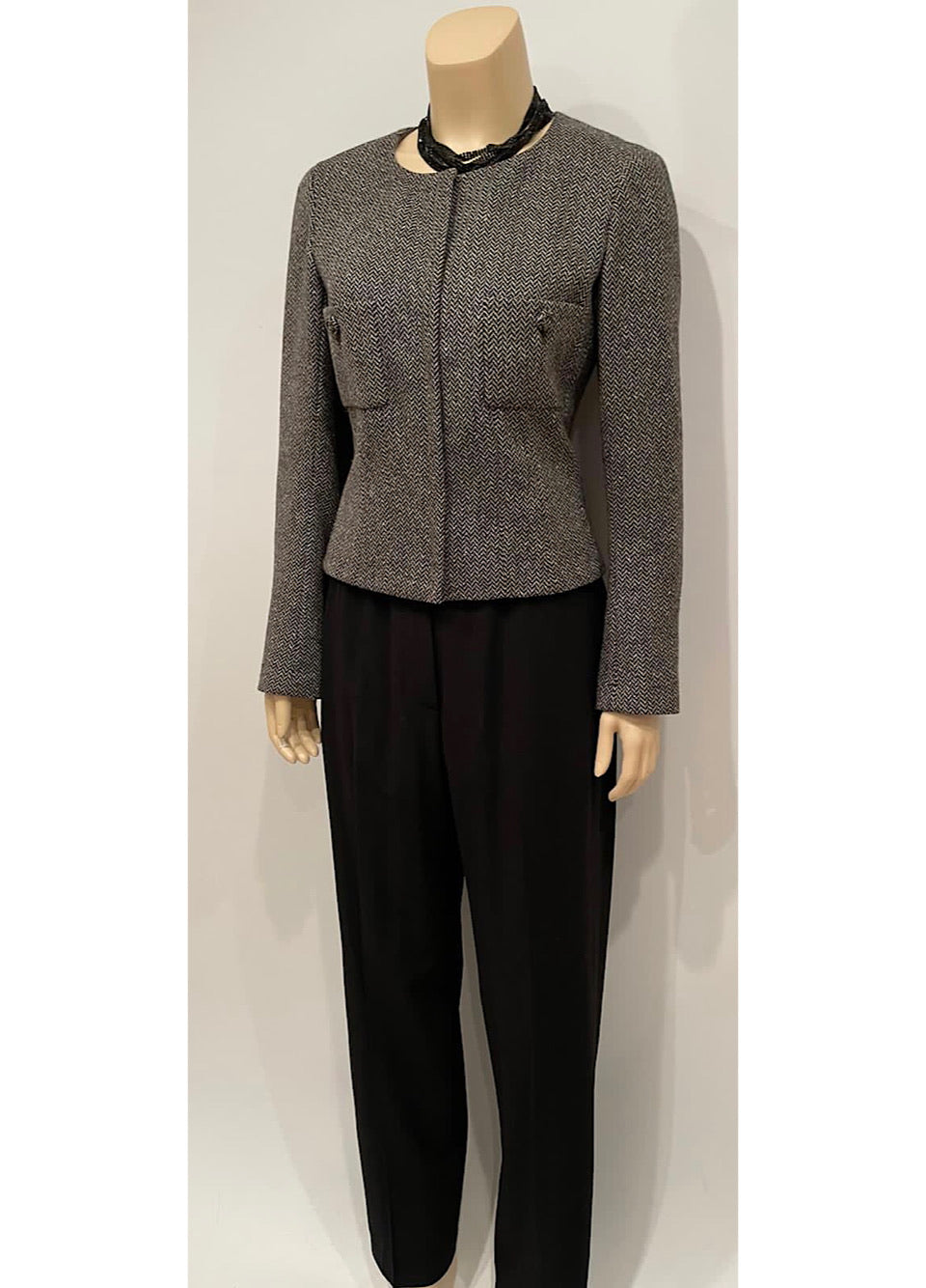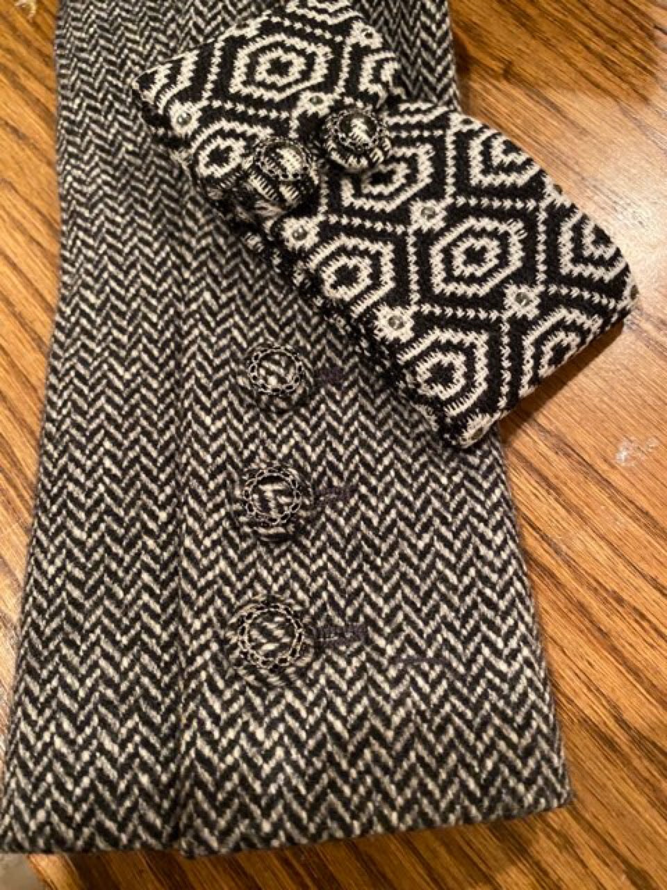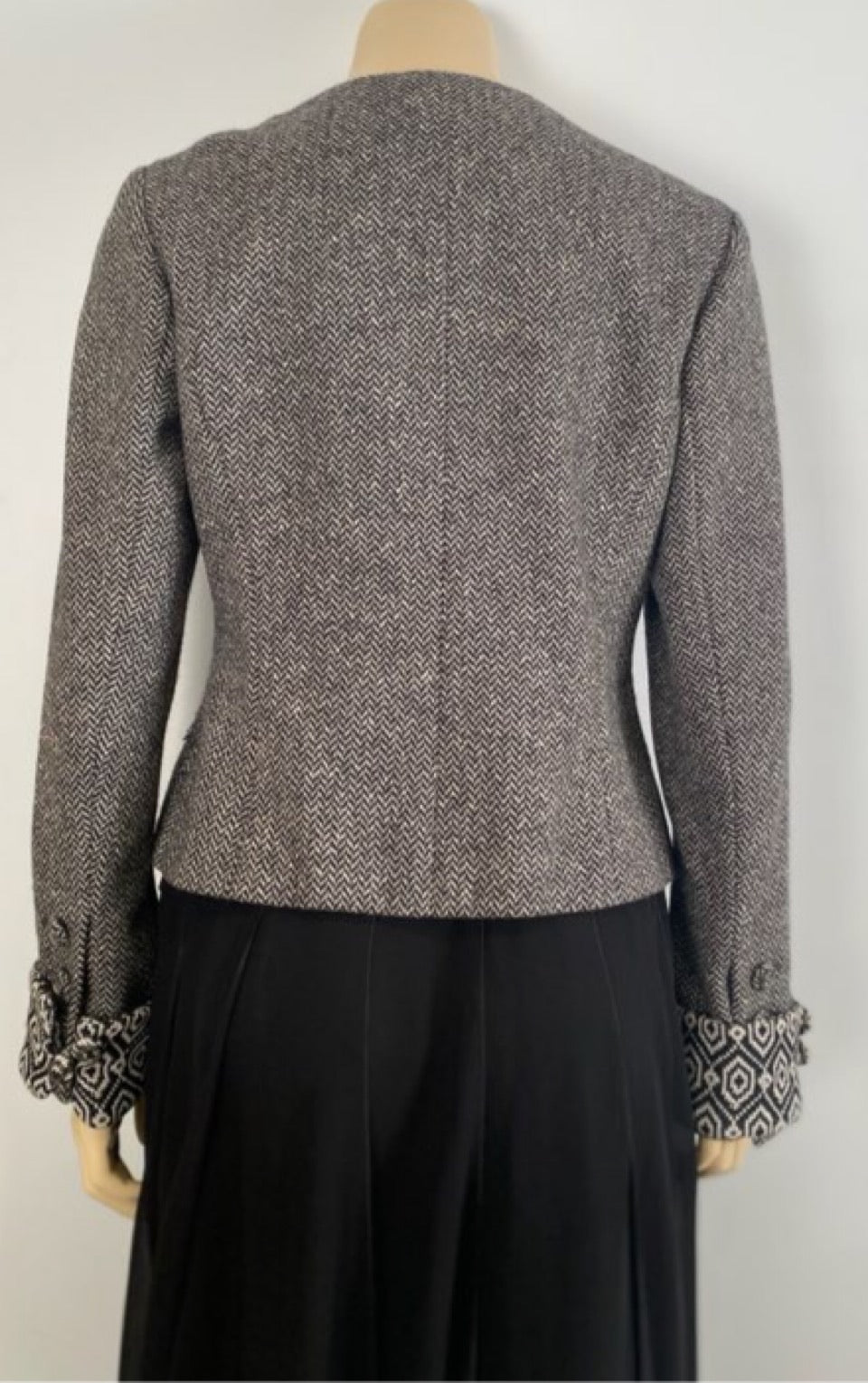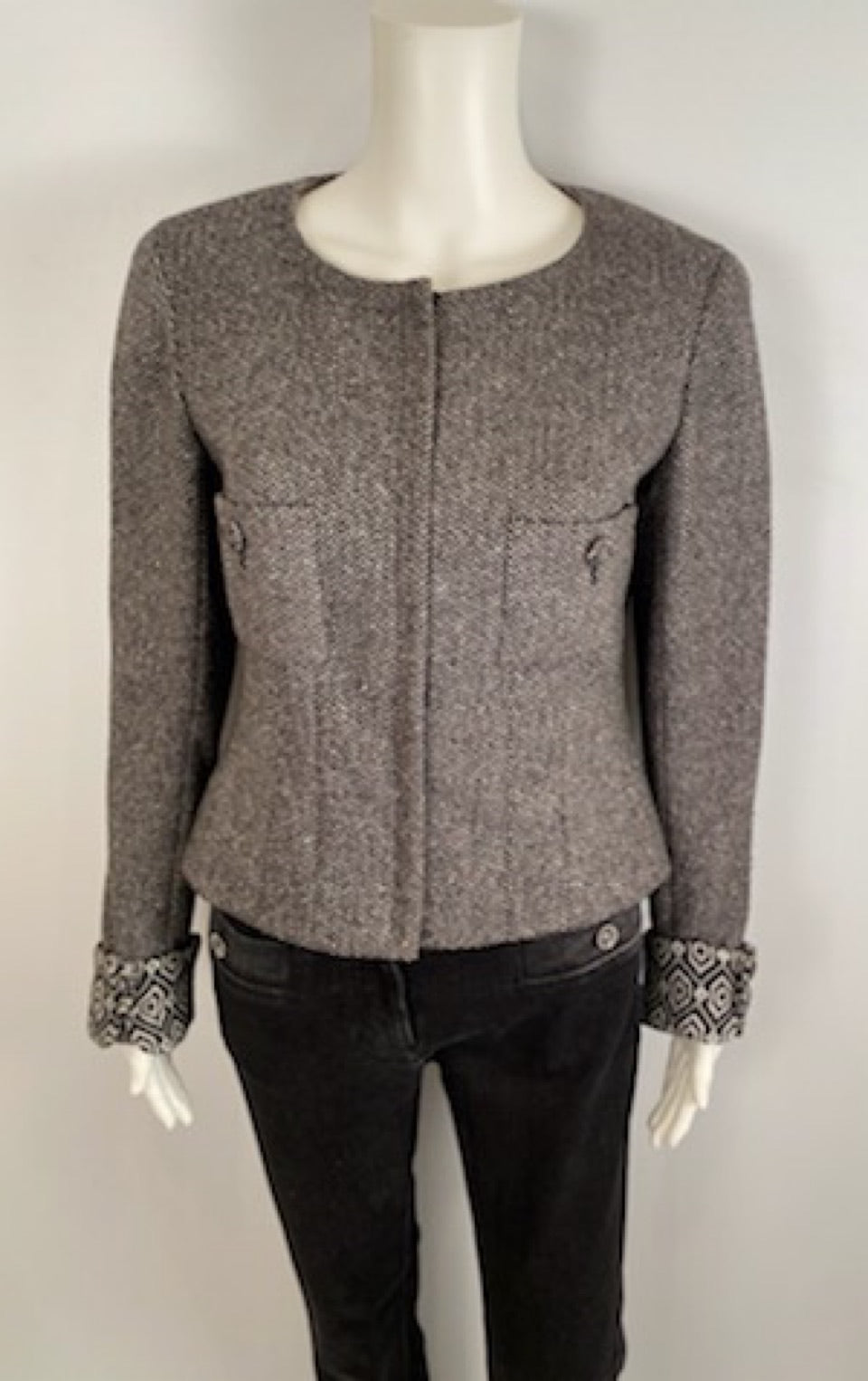 This fabulous jacket has an extra set of Removable cuffs which are attach at the end of each sleeve. Each removable cuff has 2 buttons and 25 crystals. Small herringbone pattern in black, ivory, and shades of gray. There are 8 chanel fabric buttons, with pewter chain around the top, woven with tiny black leather. There are 3 on each sleeve, 1 on each patch pocket on the front. The jacket fastens with a hidden zipper. Fully lined, chanel chain around the bottom of the lining. Plain collar which great for scarves or necklaces to create a variety of looks.