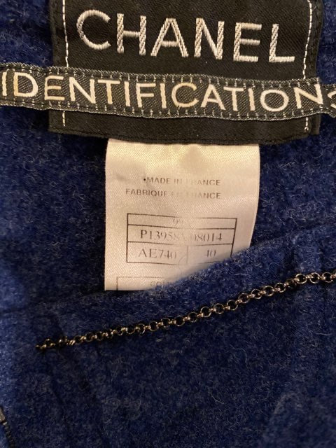 Vintage Chanel Identification 99A, 1999 Fall Boiled Wool Fitted Dusty dark blue jacket with raised seams. Zips up the front, zipper pull has “Chanel” on the front. Slits at wrists. It has the famous Chanel chain around the hem to make sure it hangs evenly. Unlined so it is not bulky.