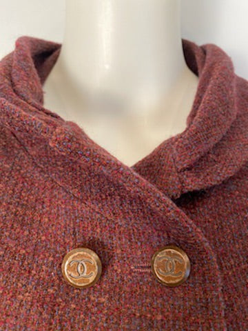 This maroon jacket is actually threads of different colors which look maroon from a distance. It has an unusual pleated collar and pleated cuffs. There are intentionally distressed metal buttons, each with a large “CC” logo, 10 for closure and 2 on each sleeve.