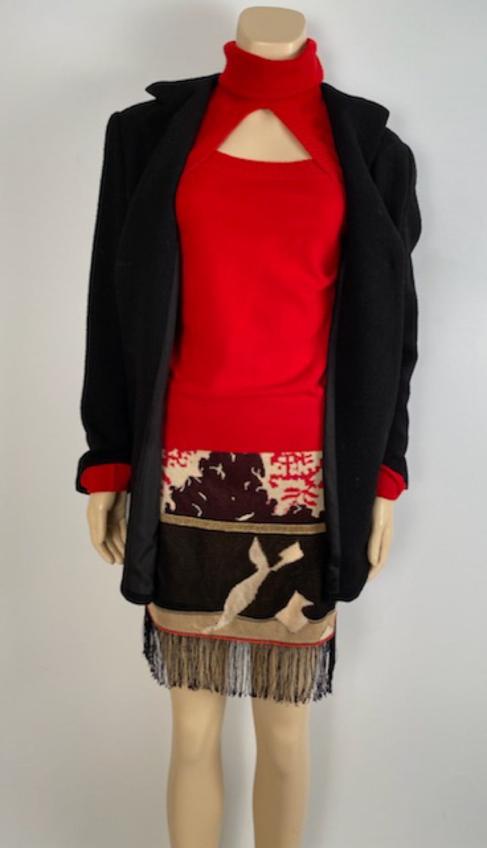 Shown with a Chanel cut out front sweater and a fringed mini skirt, under “Shop All”.