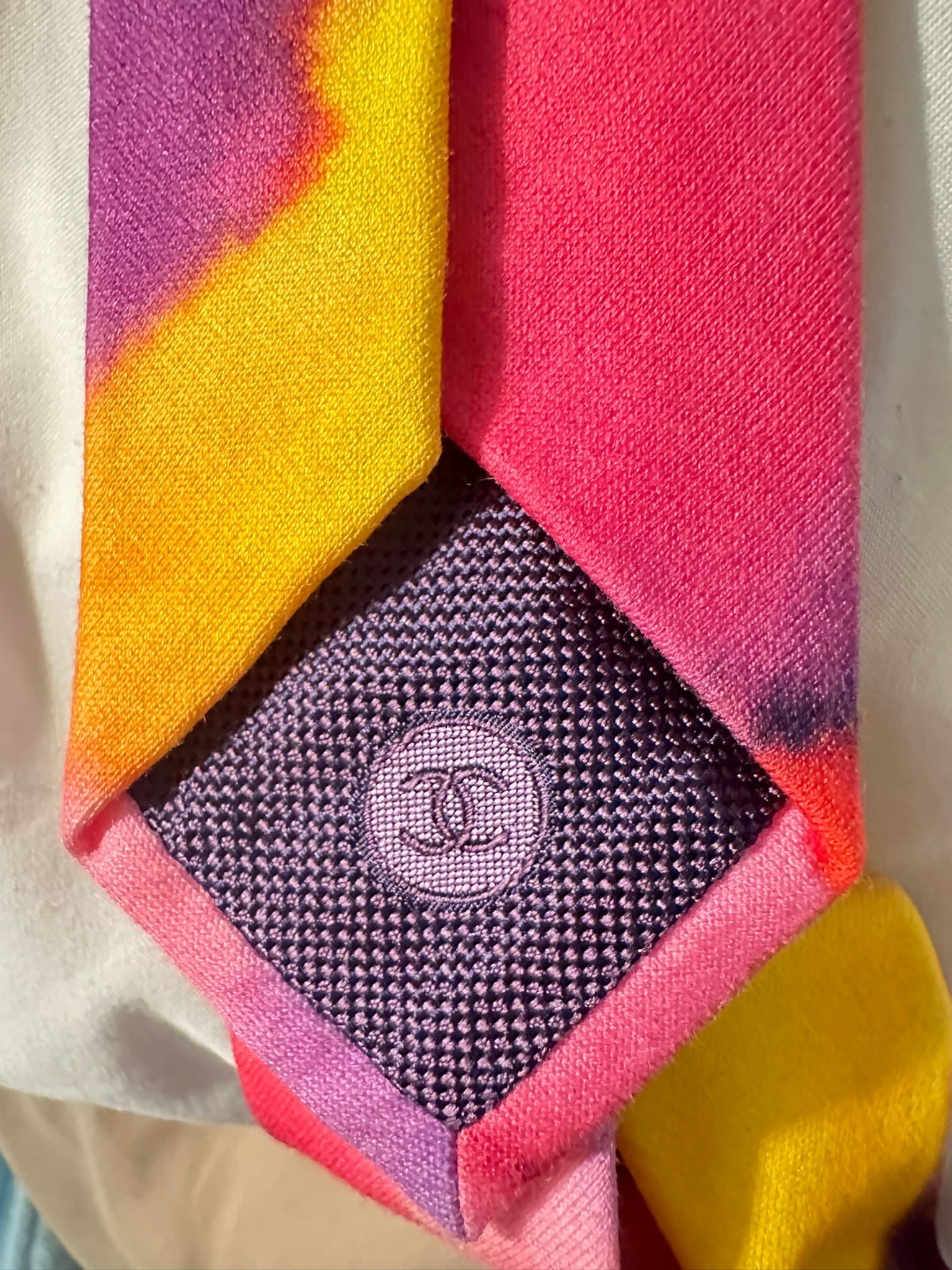 Beautiful Chanel necktie colorful and happy. It is 60" long-standard tie length-narrow 3" across at the wide end. It is cotton but has a subtle rich sheen. The CC logo is embroidered in black, 1/2" across, on the front. Perfect condition -can of course, be worn by both ladies and gentlemen.