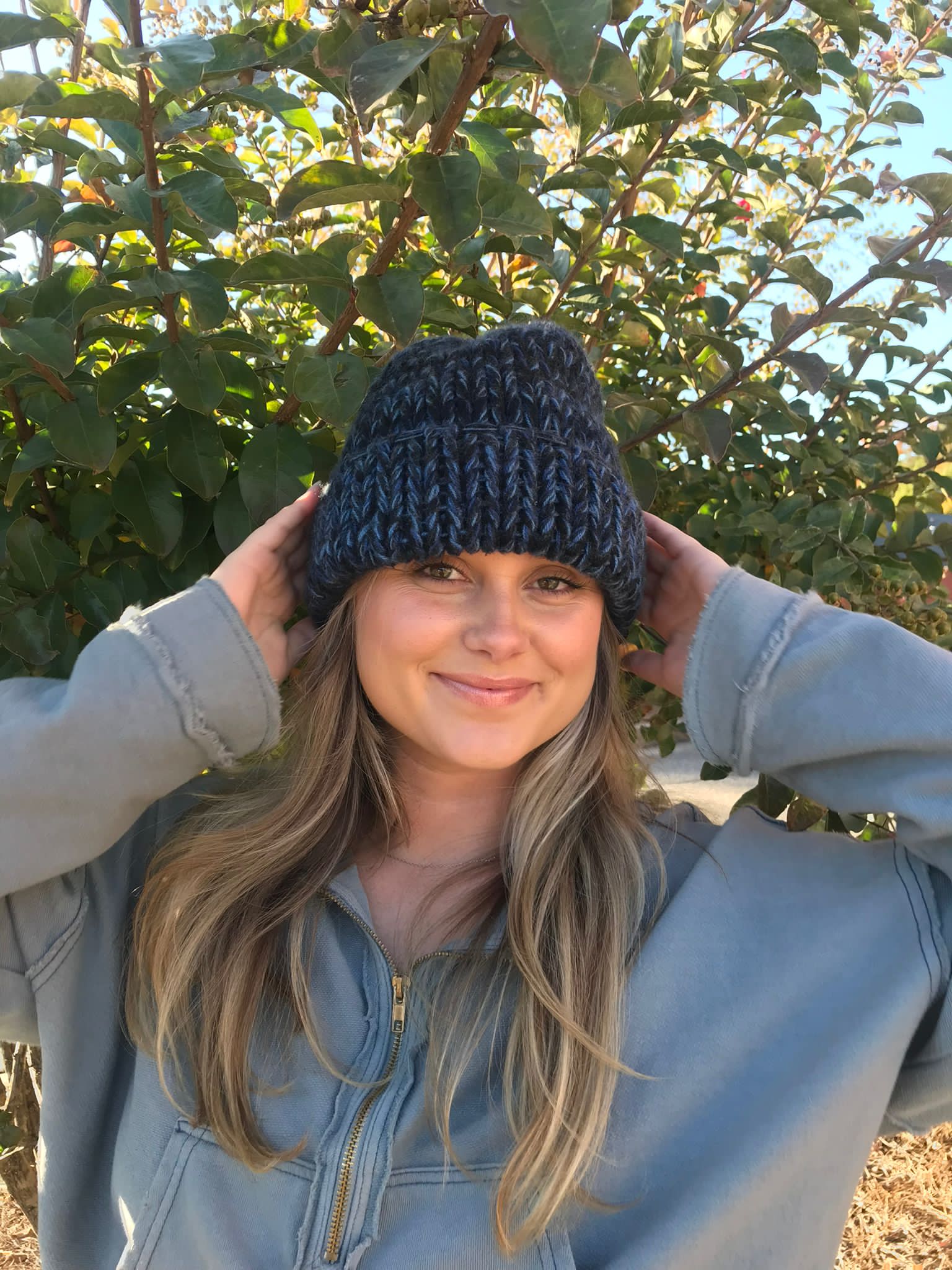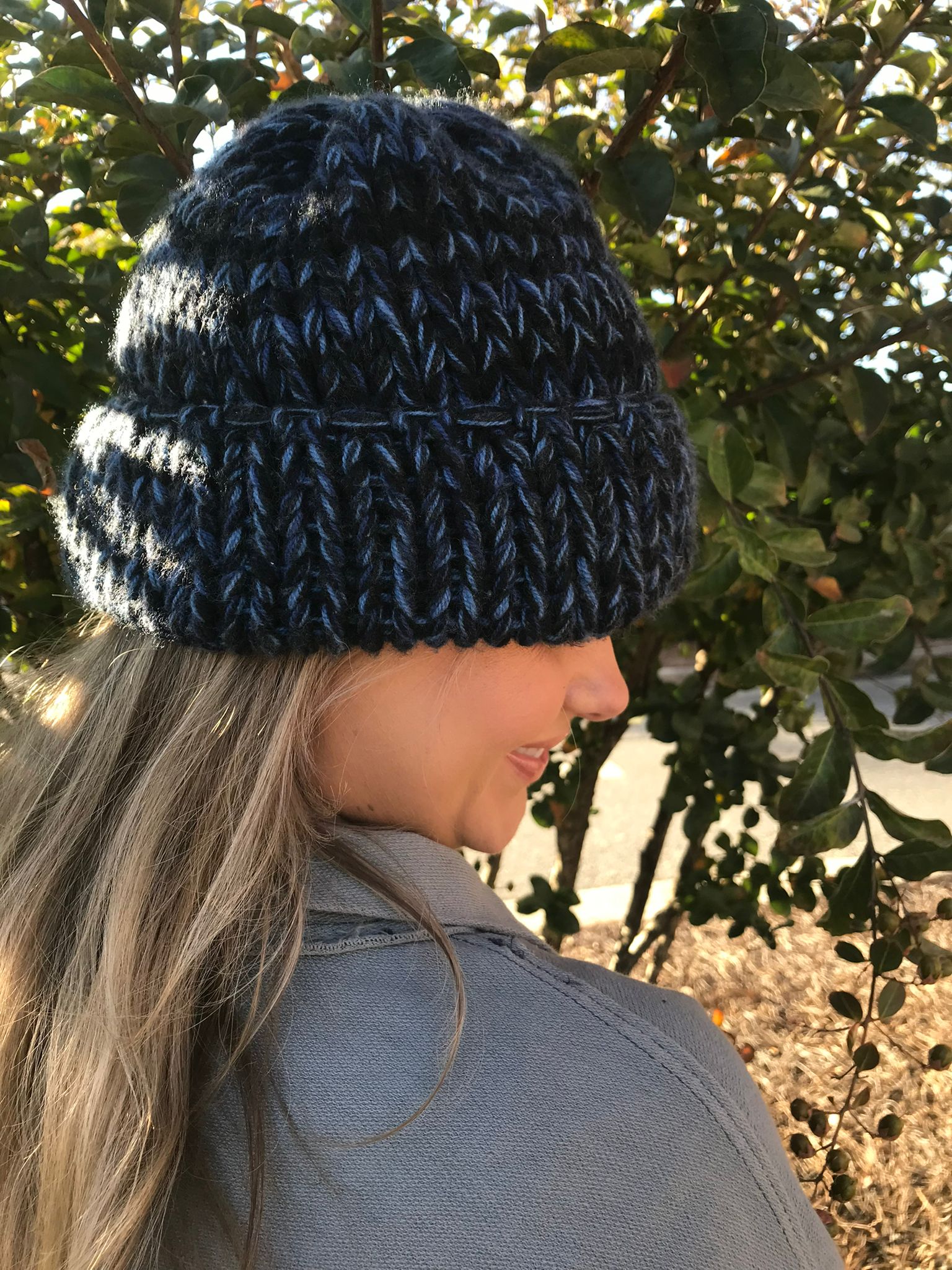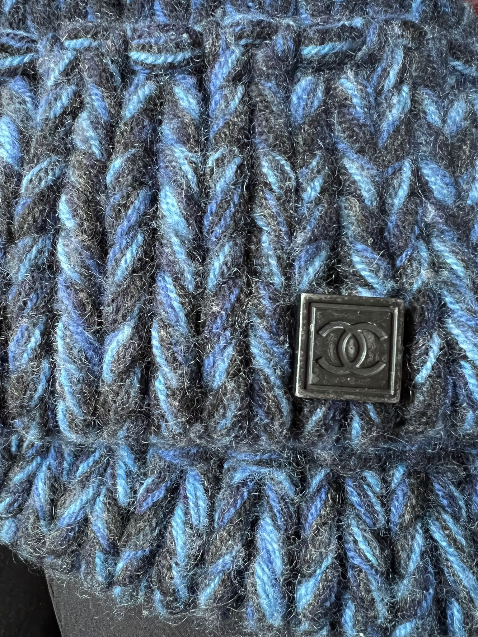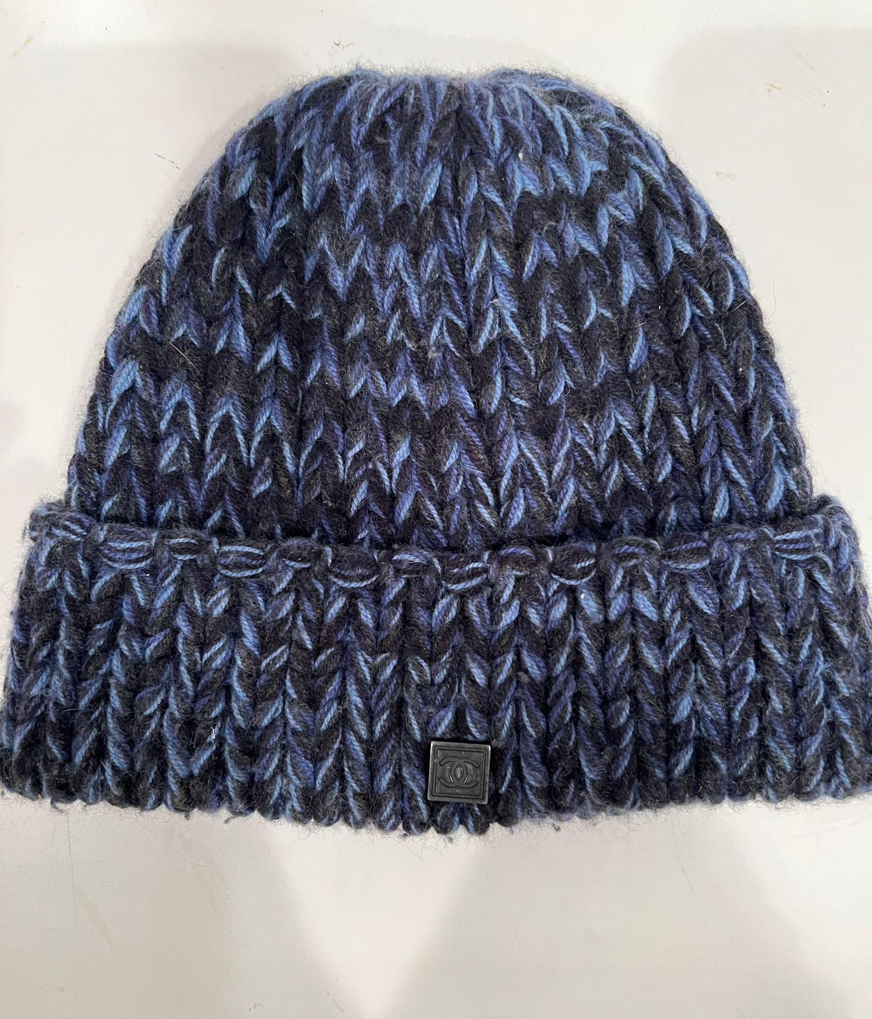 Chanel Blue cashmere knit cap winter hat/beanie. Nice and warm. Knit cap with wide yarn weave in navy and light blue. Made in Scotland. There is a 1" square metal piece sewn on the front, which has a “CC" logo on the front.