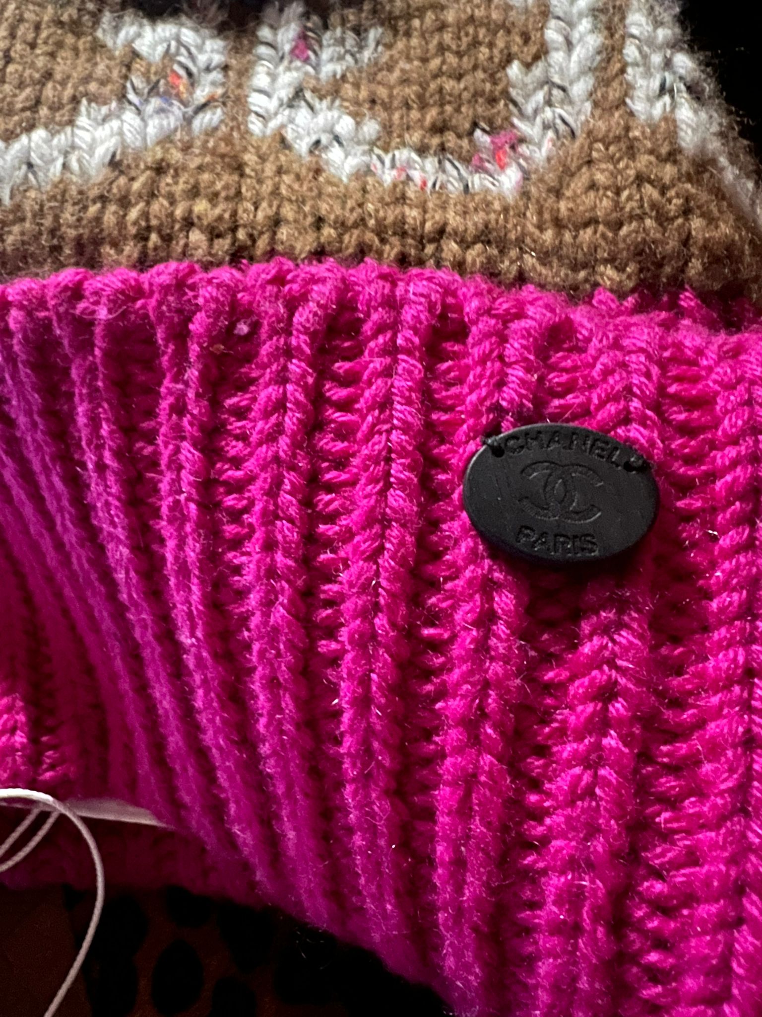 It comes with a small packet which contains samples of the yarns used, both the heavy weaves and the thinner ones as well. There is a metal oval with with "Chanel Paris" and the CC logo.