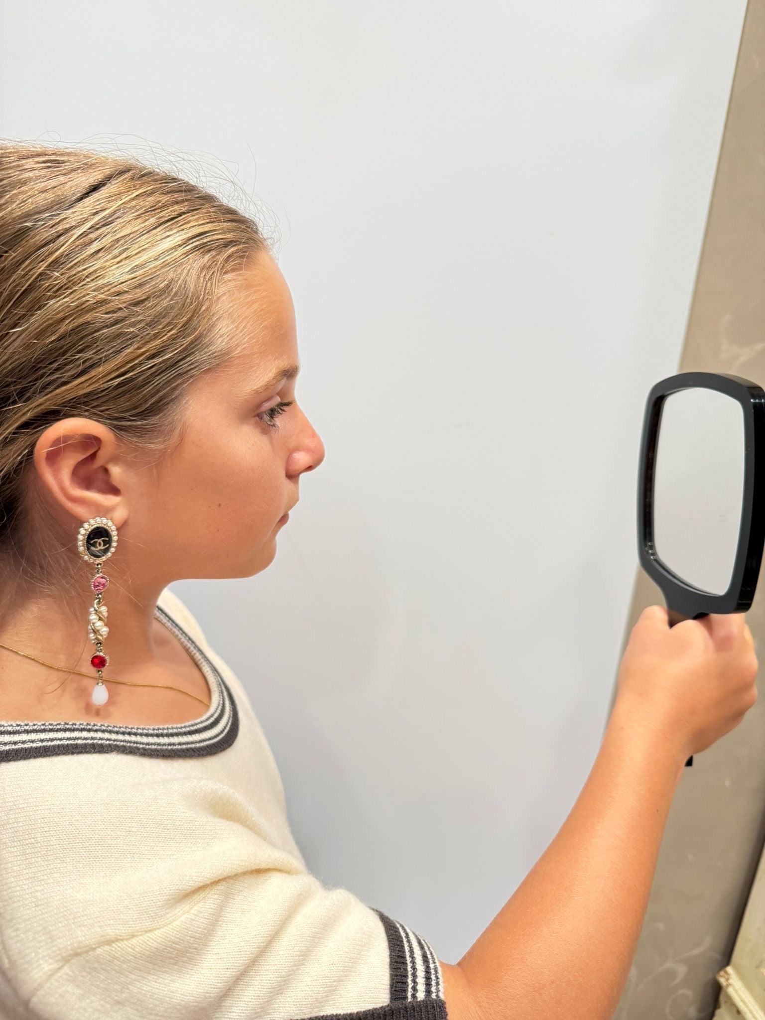 This pair of Chanel dangle earrings are showstoppers! They hang down 3 1/2", with CC logos against black cabeshon stones surrounded by tiny pearls. Each has 2 faceted red stones, and pearls intertwined with gold. They are a favorite of our guest model, Miss M.