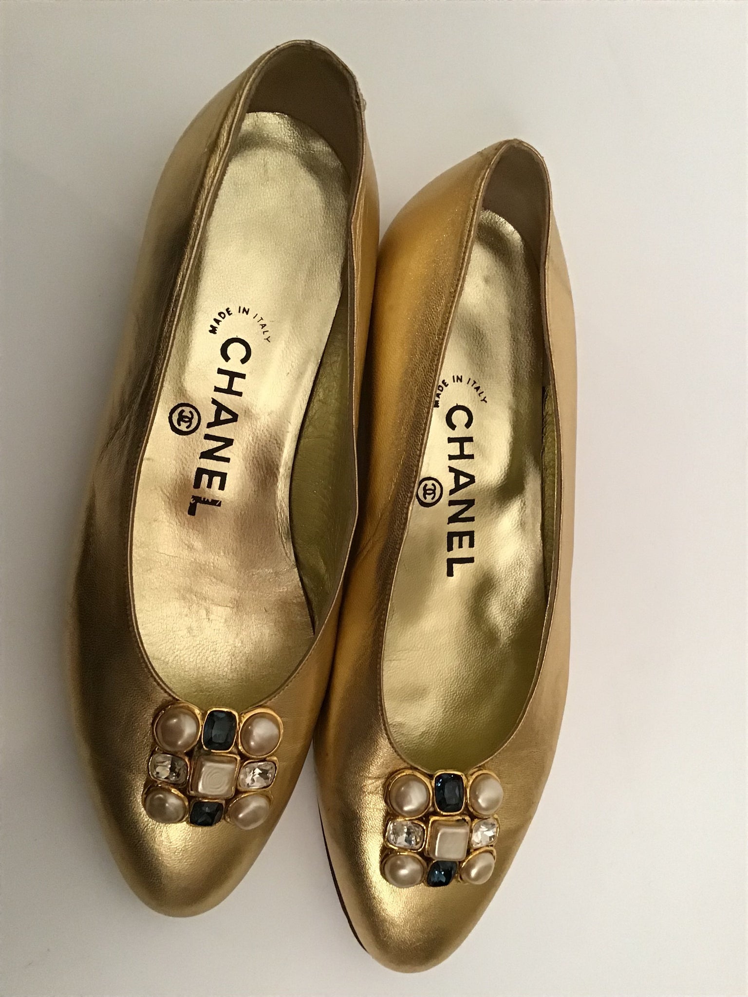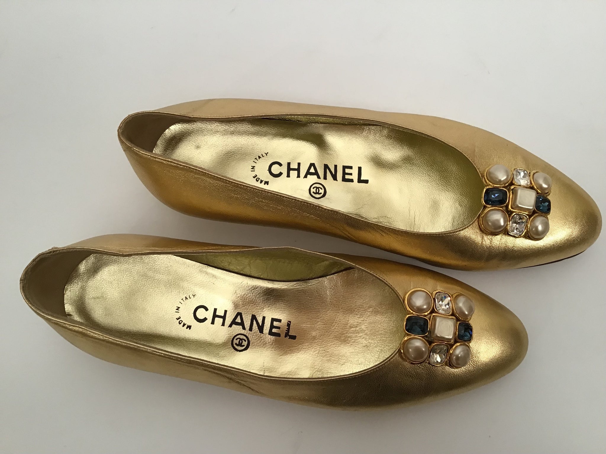 FABULOUS Chanel gold leather flats with 1 1/4" Gripoix jewels near the toe in pearls, blue crystals, and clear crystals.