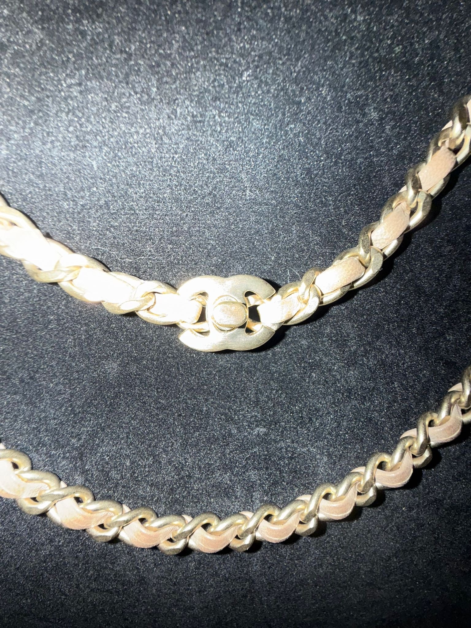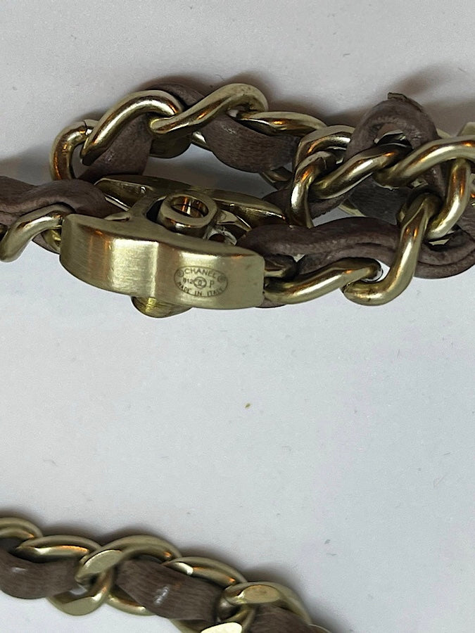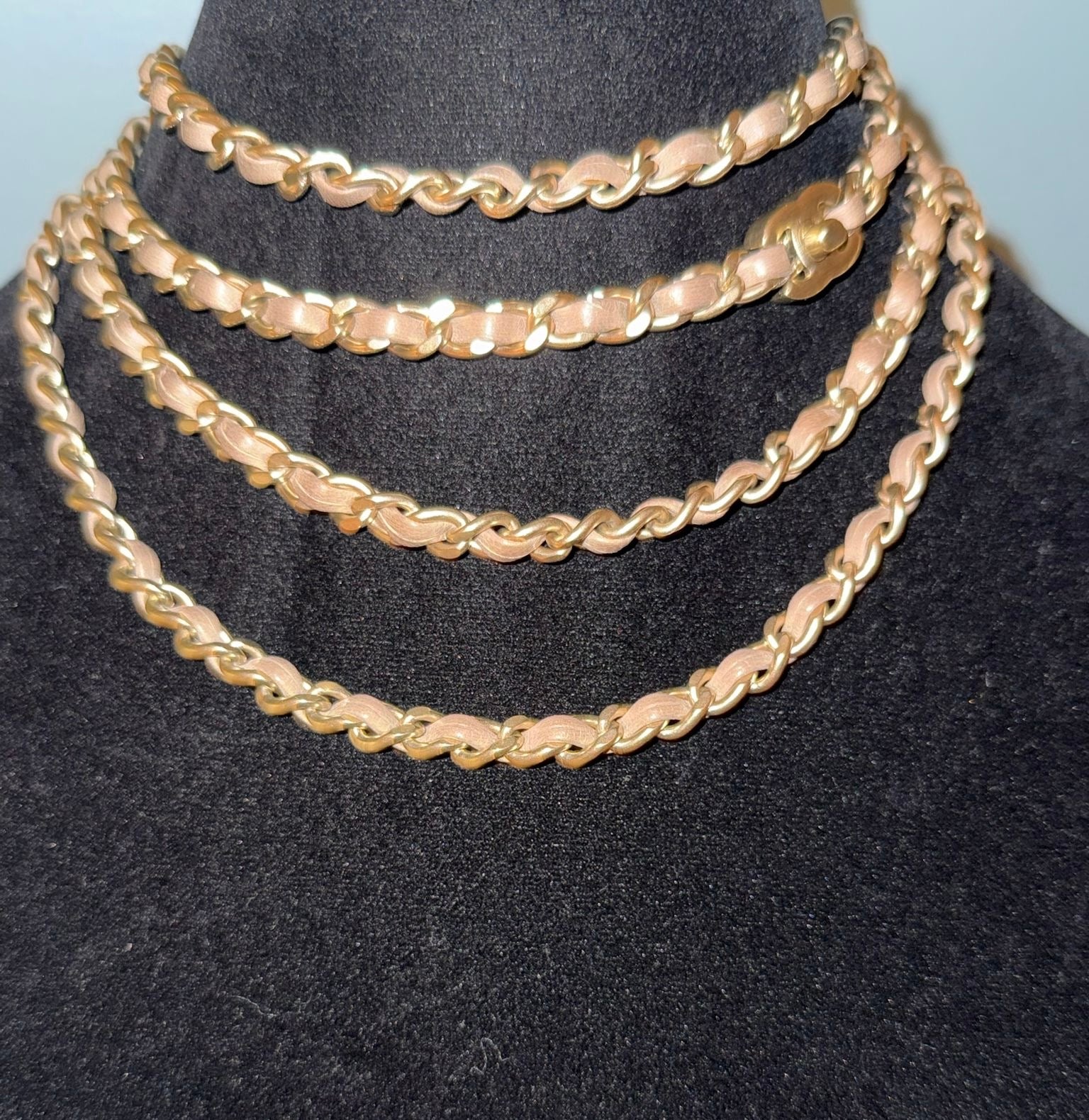 Chanel long necklace or belt, gold chain woven with light brown leather, 64" long. From Chanel’s 12P 2012 Spring Collection. Can be worn as a Necklace, Belt, or even bracelet.