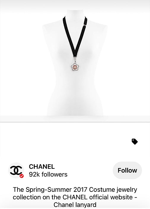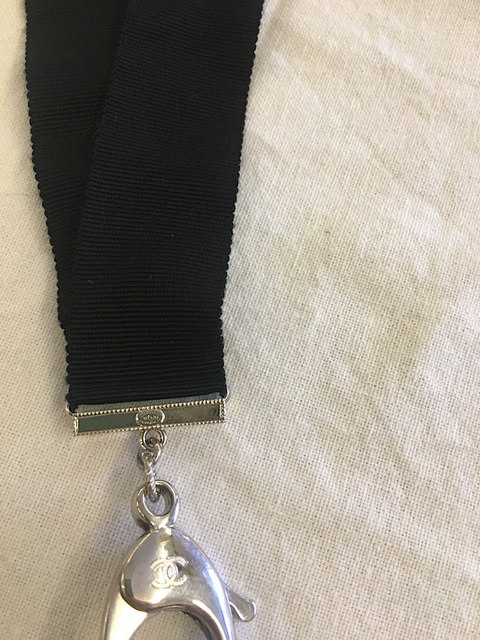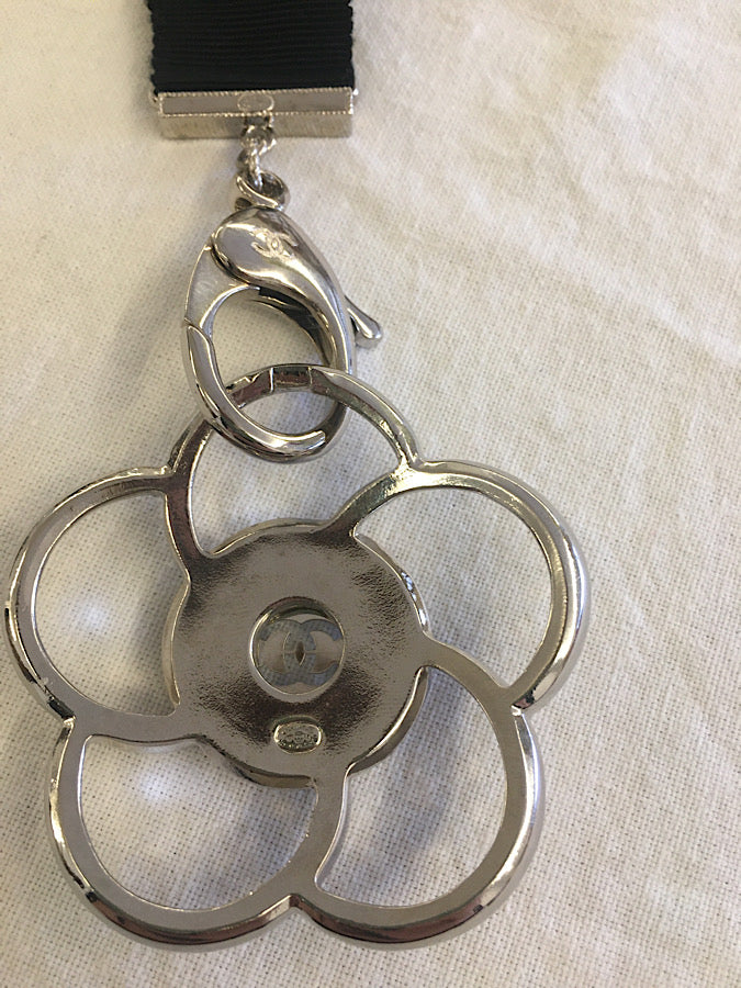 Both the lanyard itself and the camellia charm have Chanel identification ovals on the back as well. The lanyard is soft grosgrain ribbon 1/2" wide. It is 32" long with a 16" drop, 6" up on one side is an attached crystal CC logo.