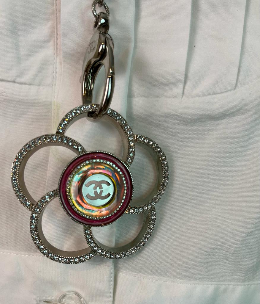 It has a beautiful detachable large 2 1/2" wide crystal encrusted open design camellia with a contemporary CC logo on a small round mirror in the center, attached by a silver lobster claw closure which has a CC logo engraved on the front.