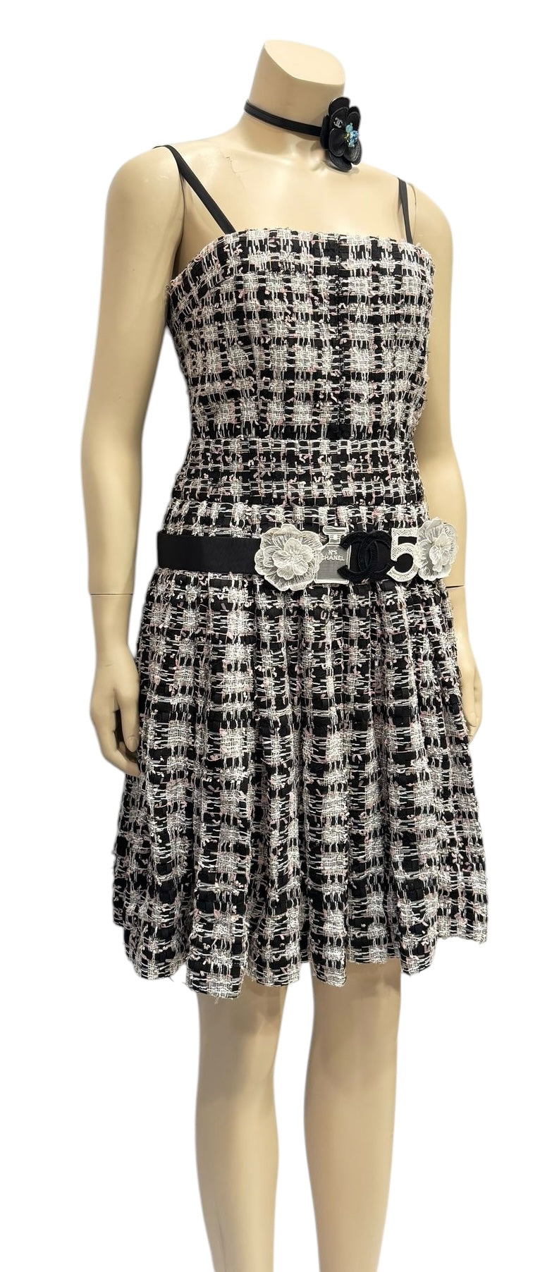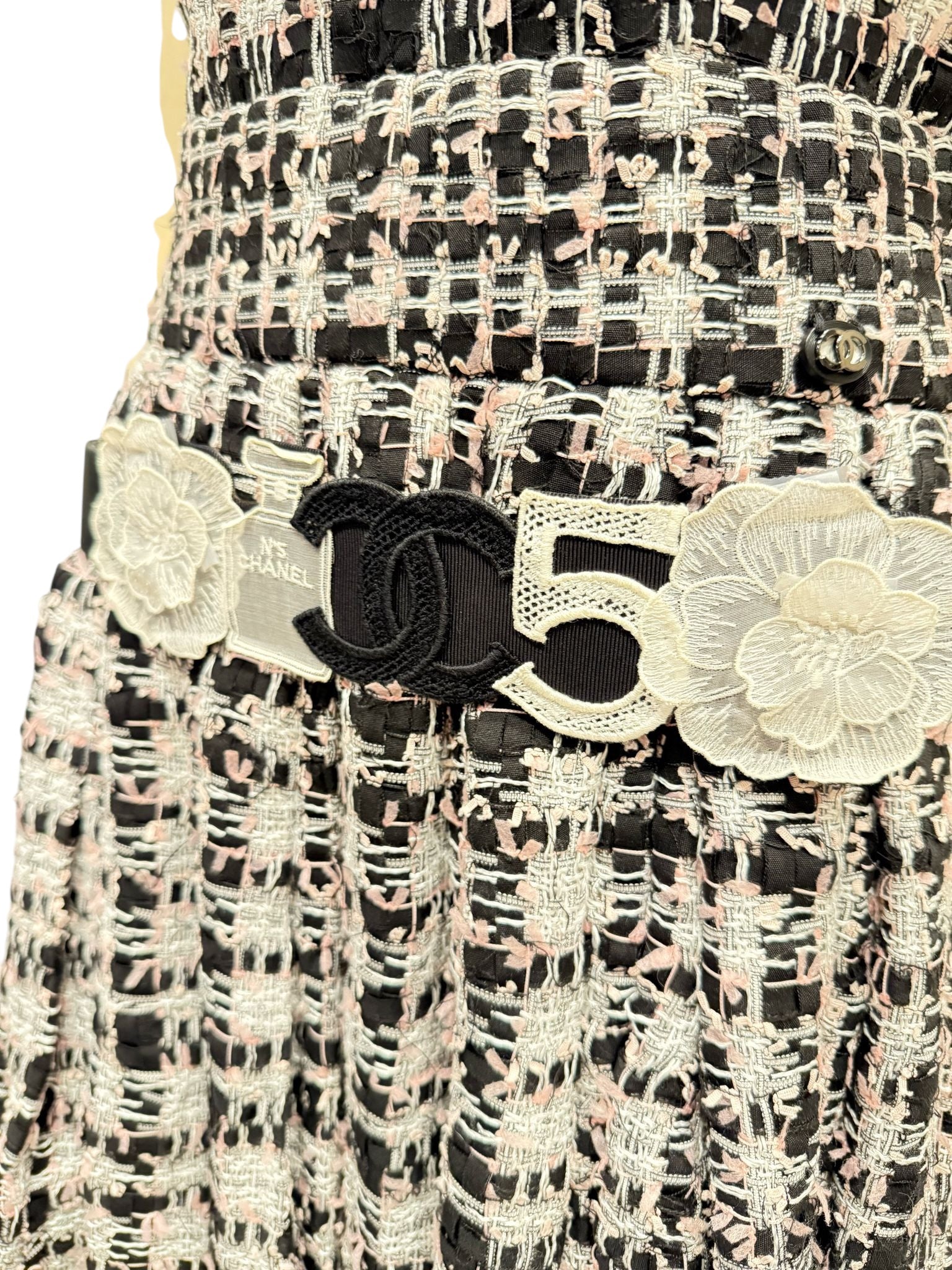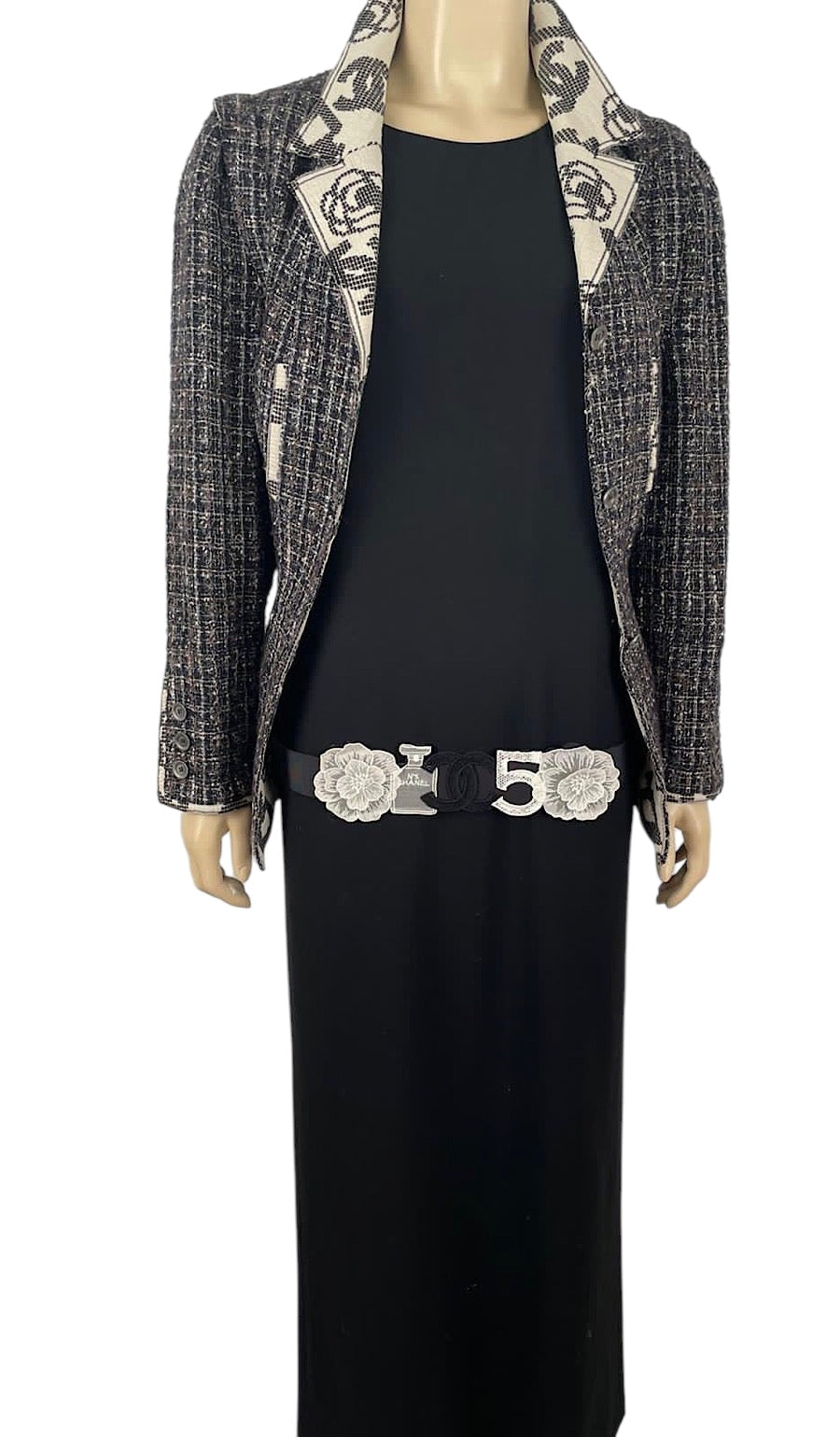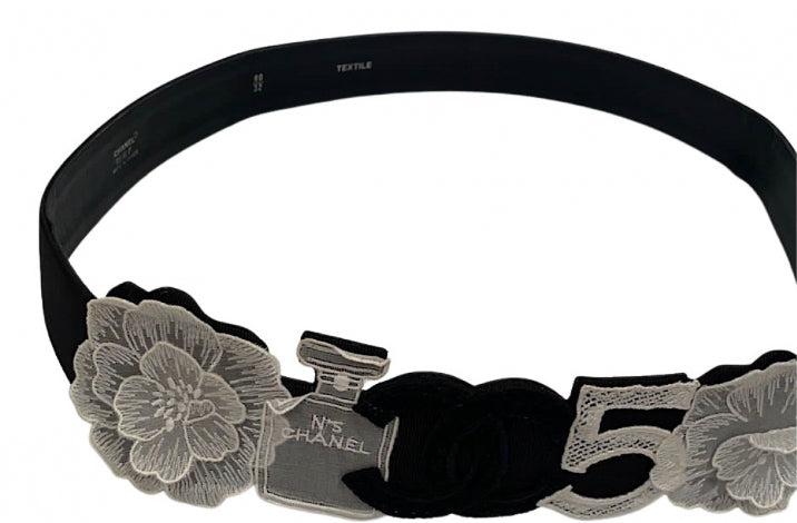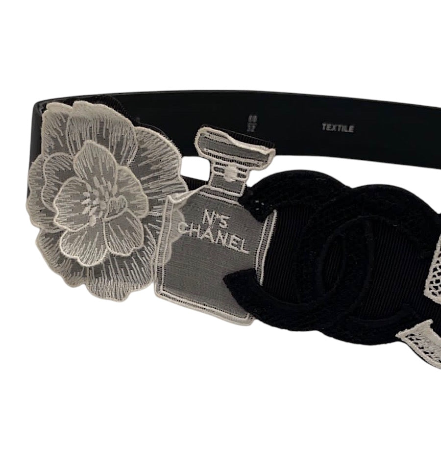This fabulous Chanel belt is faille fabric on the front backed with leather. The front has a 20" long area of attached Chanel icons in a delicate white fabric with 2 camellias. There is a bottle of Chanel number 5 stitched with diamond shaped open spaces. In the center is a 2" x 2 1/4" heavy "CC" logo. All icons are in white, except the large "CC" logo which is black and are mounted on leather.