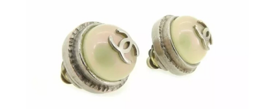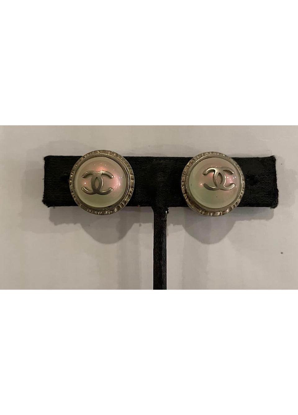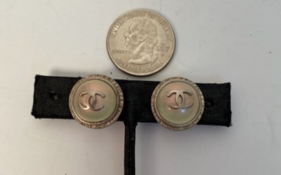 Vintage Chanel 98P, 1998 Spring Collection clip on earrings with a metal "CC" on top of a domed rainbow pearl (a pearl that has hints of other colors in certain light). A domed stone coated with Chanel's beautiful exclusive pearl coating. Brushed muted Silver backing.