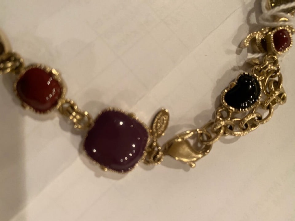 clasp closure. At the back is a 2" length of chain with a CC logo at the end. This chain allows you to adjust the length within the 2" adjustment. There is a gold "CC" logo on one of the stones, and a hang tag which identifies the collection number and year( 2008, autumn) condition is pristine.