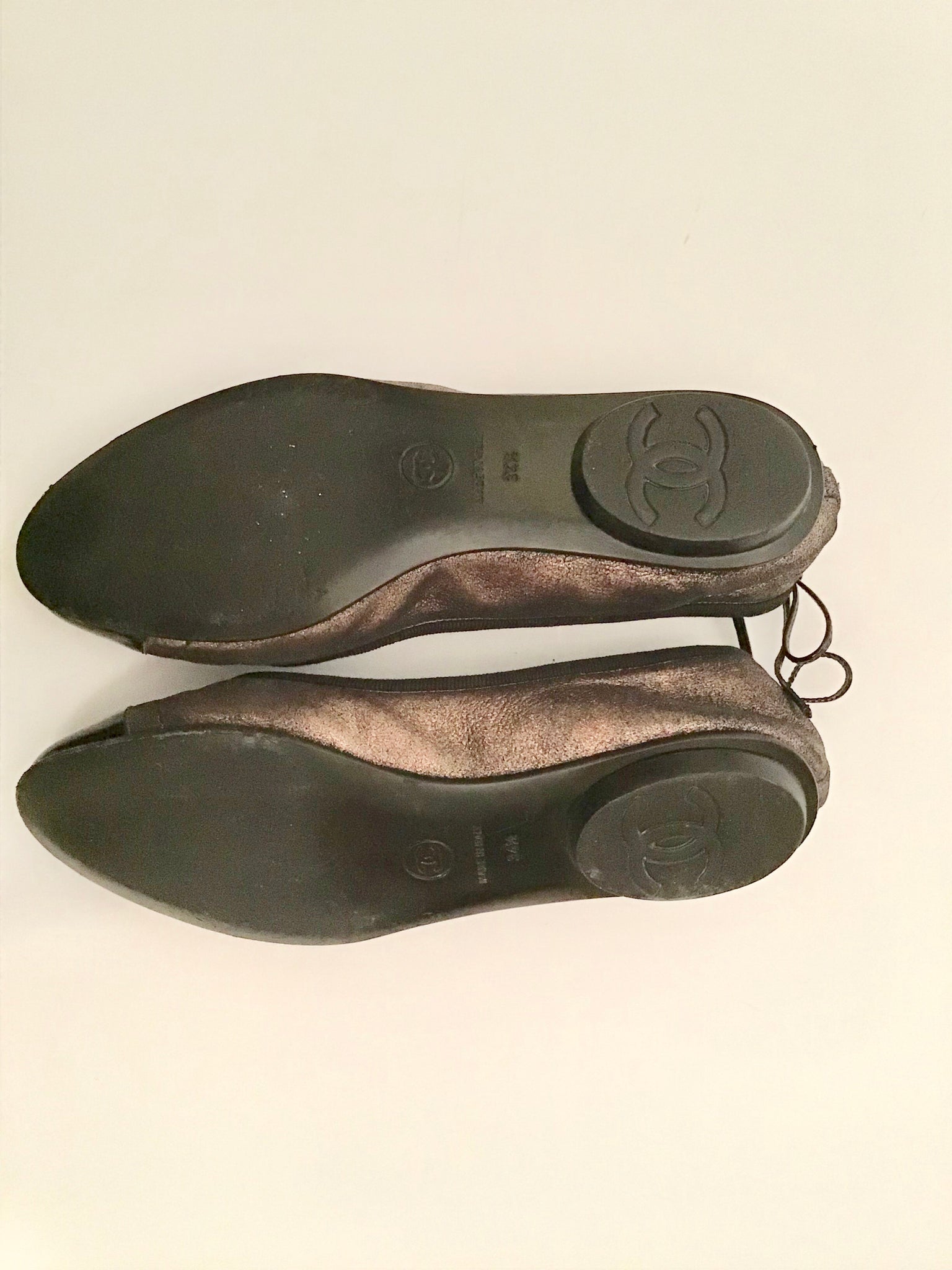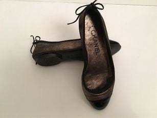 Chanel Ballet Flats patent leather cap toes, as are the bows on the back. They look like metallic black/bronze leather, but they are fabric. There is a large "CC" logo on the bottom of the heel.